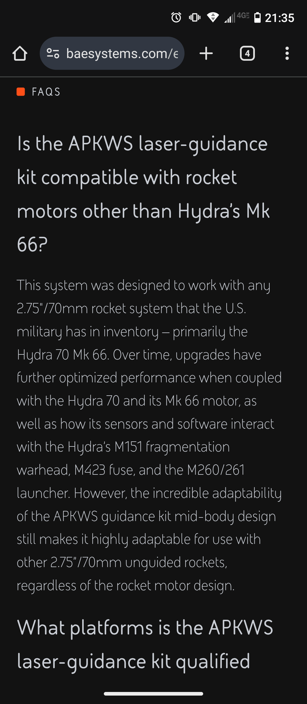 There is an error in the opening post, the quantity of APKWS II that can be carried is only up to a maximum of 28 (4 x 7 AUR) rockets, as the “Extended Length Launch Tube”(LAU-131A/A) is longer than the regular 70mm Hydra , as such it only has 7x podded options, no Long 19x AUR Pod currently exists.