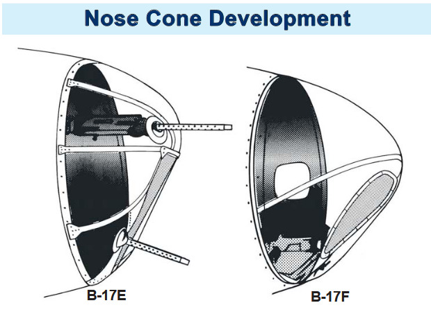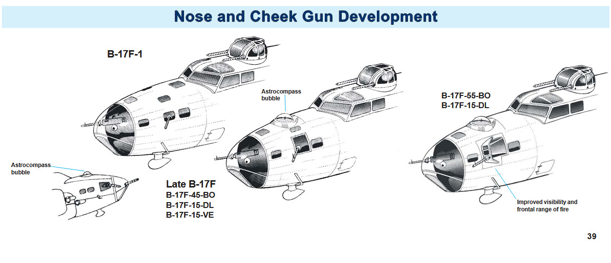 Beginning with B-17F-1-VE and B-17F-10-DL, factory-fitted glide bomb attachments were introduced. To address the vulnerability to frontal attacks, field modifications added cheek guns in the nose of some early aircraft. These were later incorporated into production, starting with B-17F-55-BO and B-17F-15-DL, using bulged side windows to improve visibility and firing angles.
