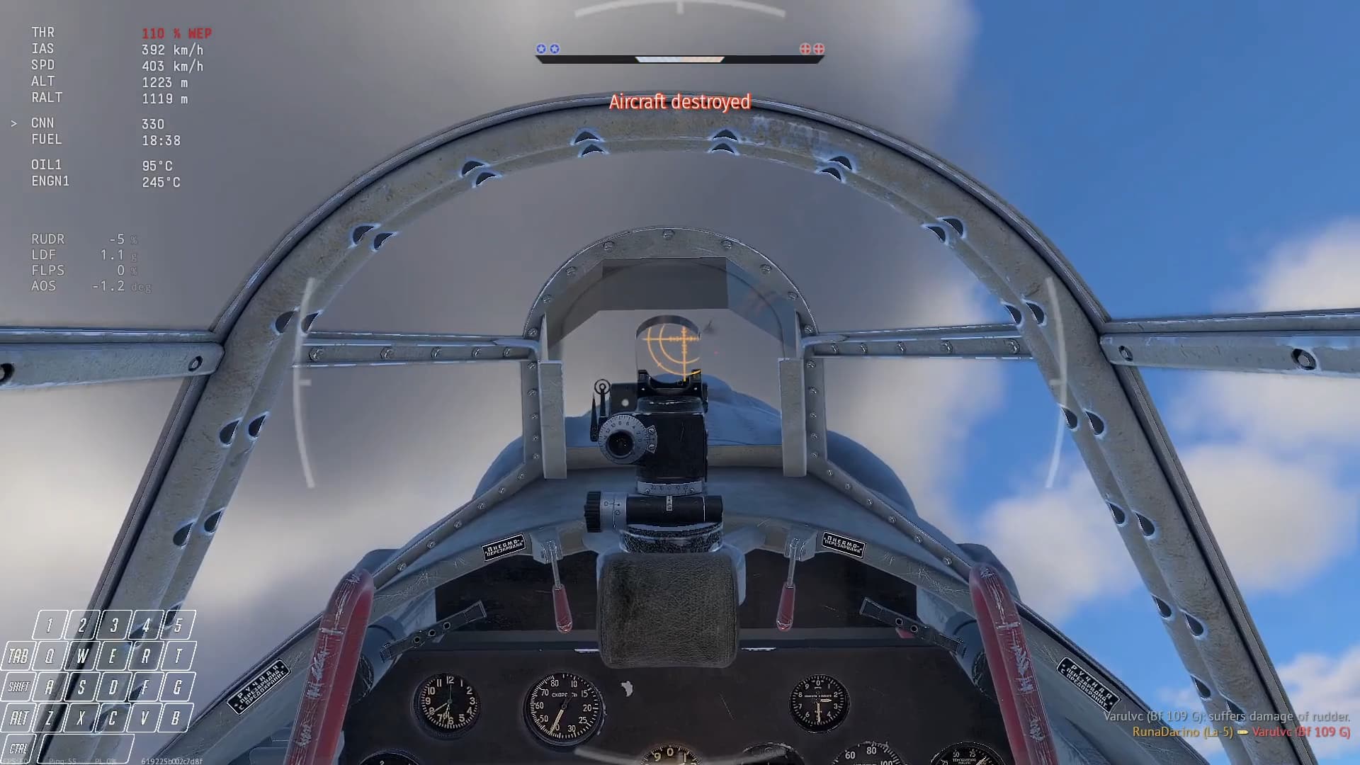 The 109 G got hit by one of the invisible rounds and lost its tail (no “pilot unconcious” message, no “severe damage”, “aircraft destroyer” meaning: tail removed)