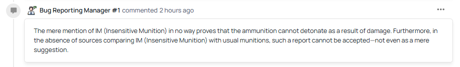Bug Reporting Manager thinks the pressure cartridge on APFSDS rounds detonate with NC propellent when it is clearly presented NC in the event of damage the effected ammunition will just slowly burn off after releasing the pressure from the propellent cartridge, which is stated about 0.09 Bar / 9 kPa.