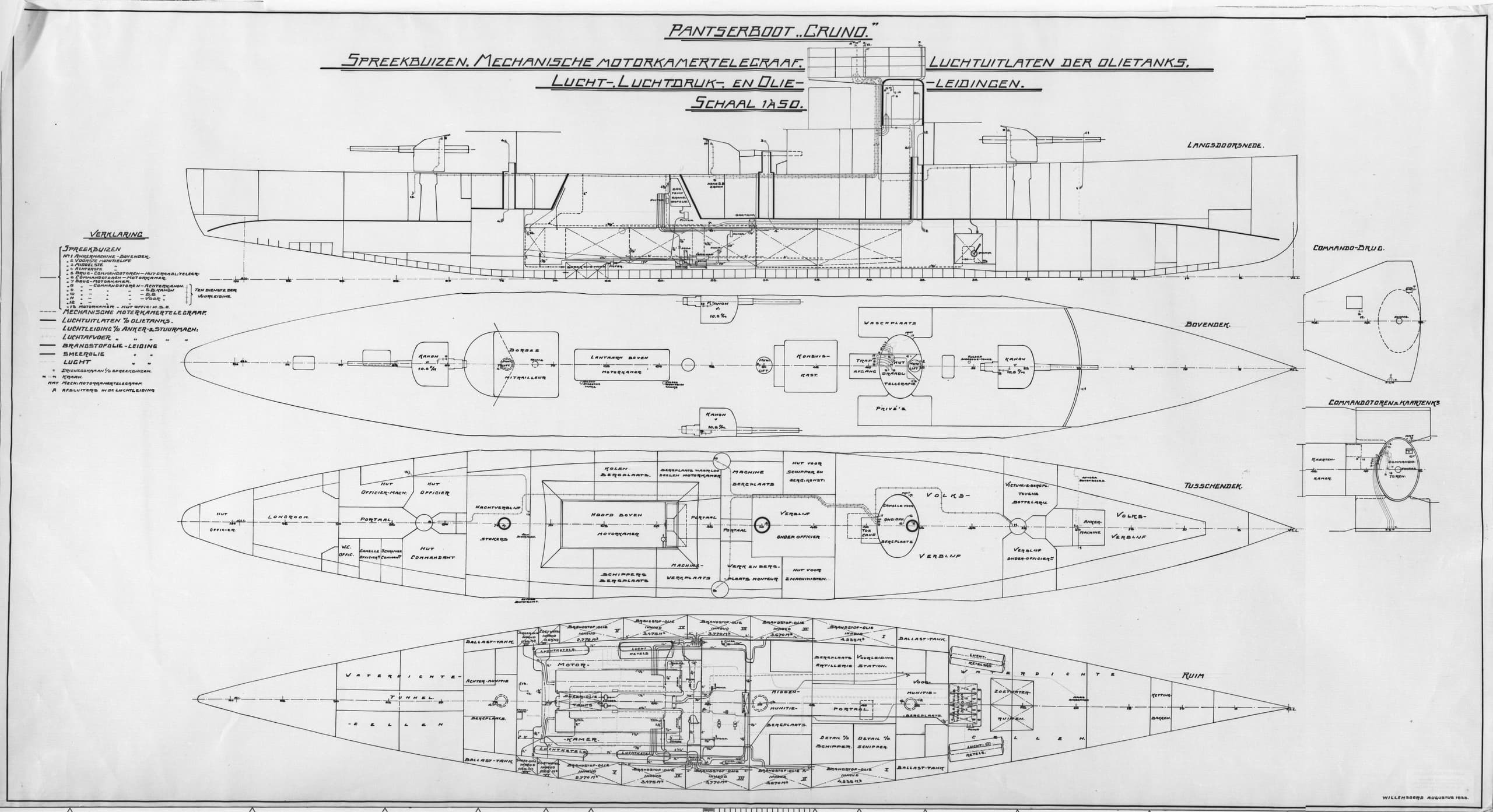 A blueprint of HNLMS Gruno, showing the various air vents and oil tanks, and also the internal armour layout that runs throughout the ship