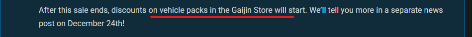 After this sale ends, discounts on vehicle packs in the Gaijin Store will start. We’ll tell you more in a separate news post on December 24th!