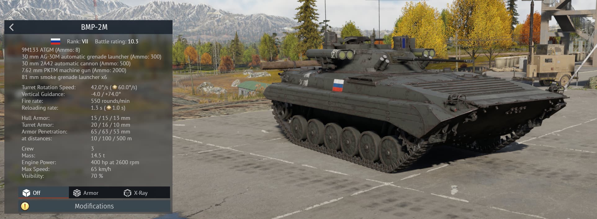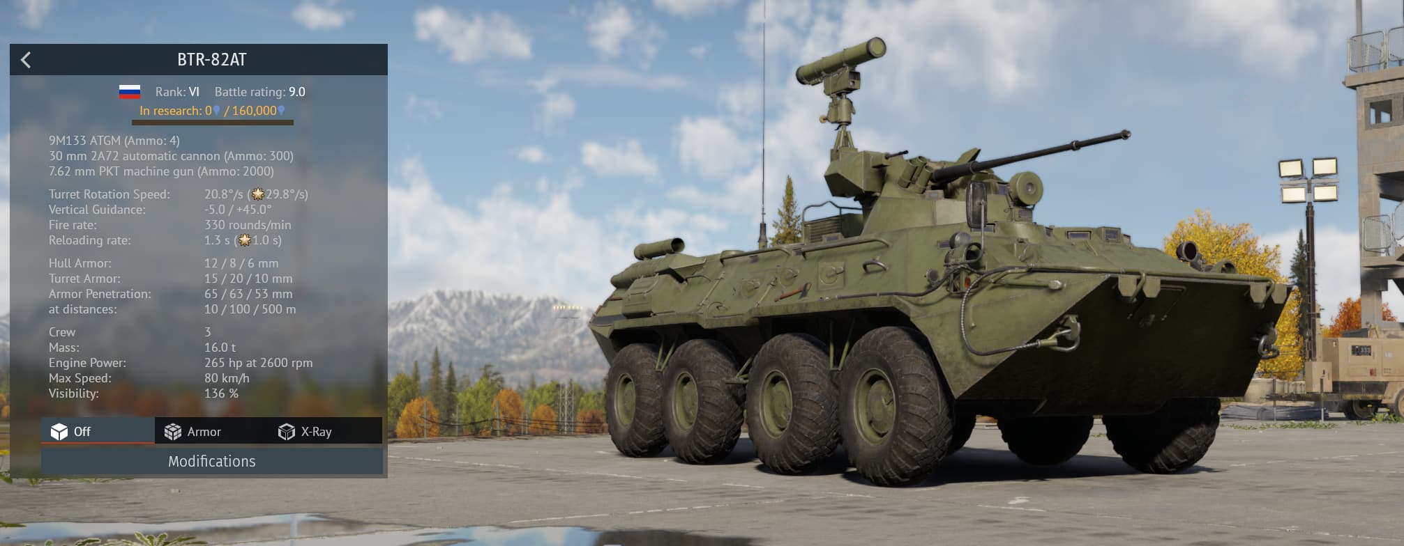 The new BTR-82AT and BMP-2M both use the 9M133 beam riding ATGM. The BMP-2M can fire its ATGM while moving at any speed, but the BTR-82AT can only fire its ATGM when going under 5km.