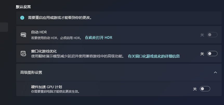 补充:右键“开始”图标选择“设置”,然后依次选择 系统 → 屏幕 → 显示卡 即可进入该设置界面,如需关闭硬件加速 GPU 计划请点开“高级图形设置”的下拉菜单