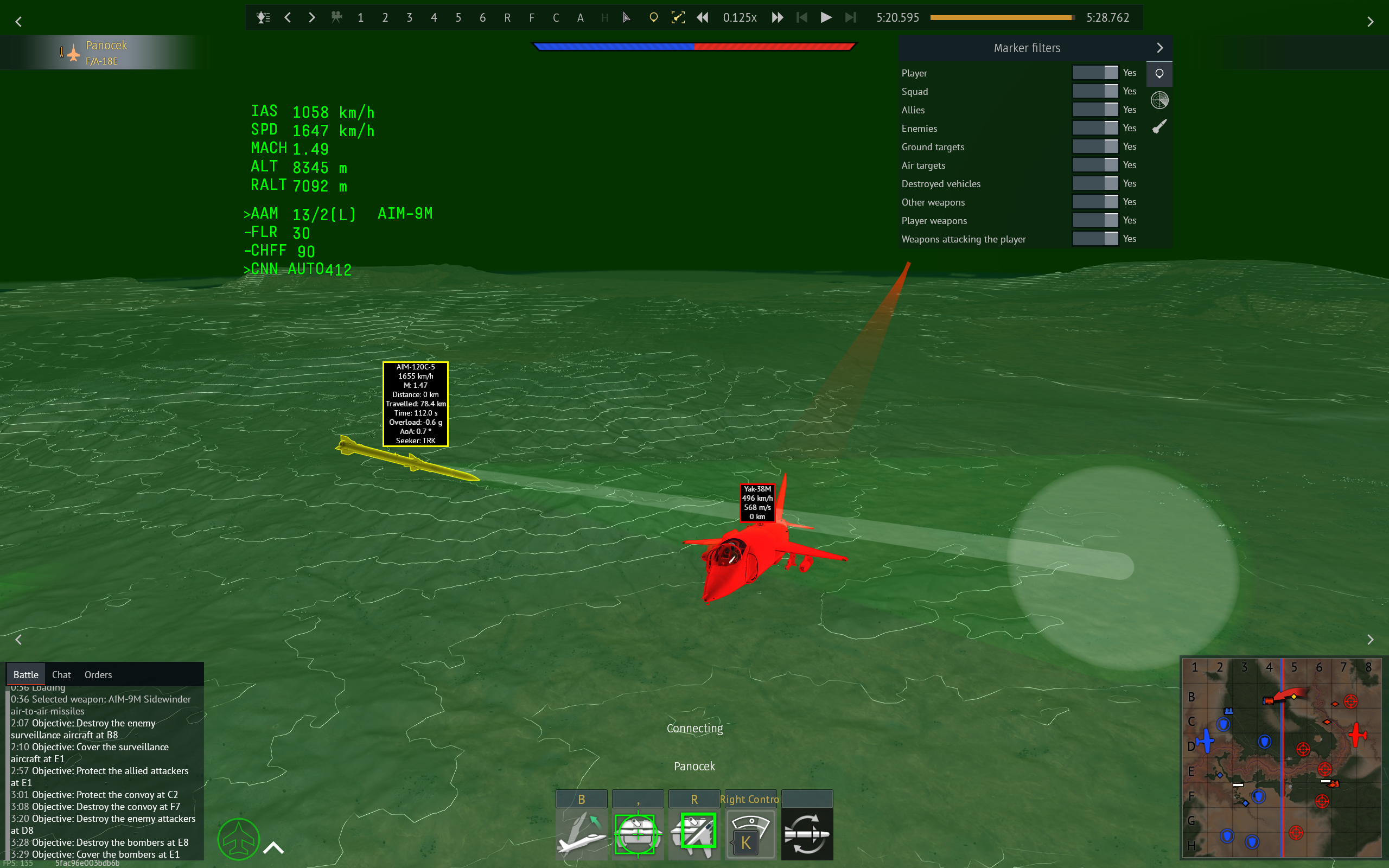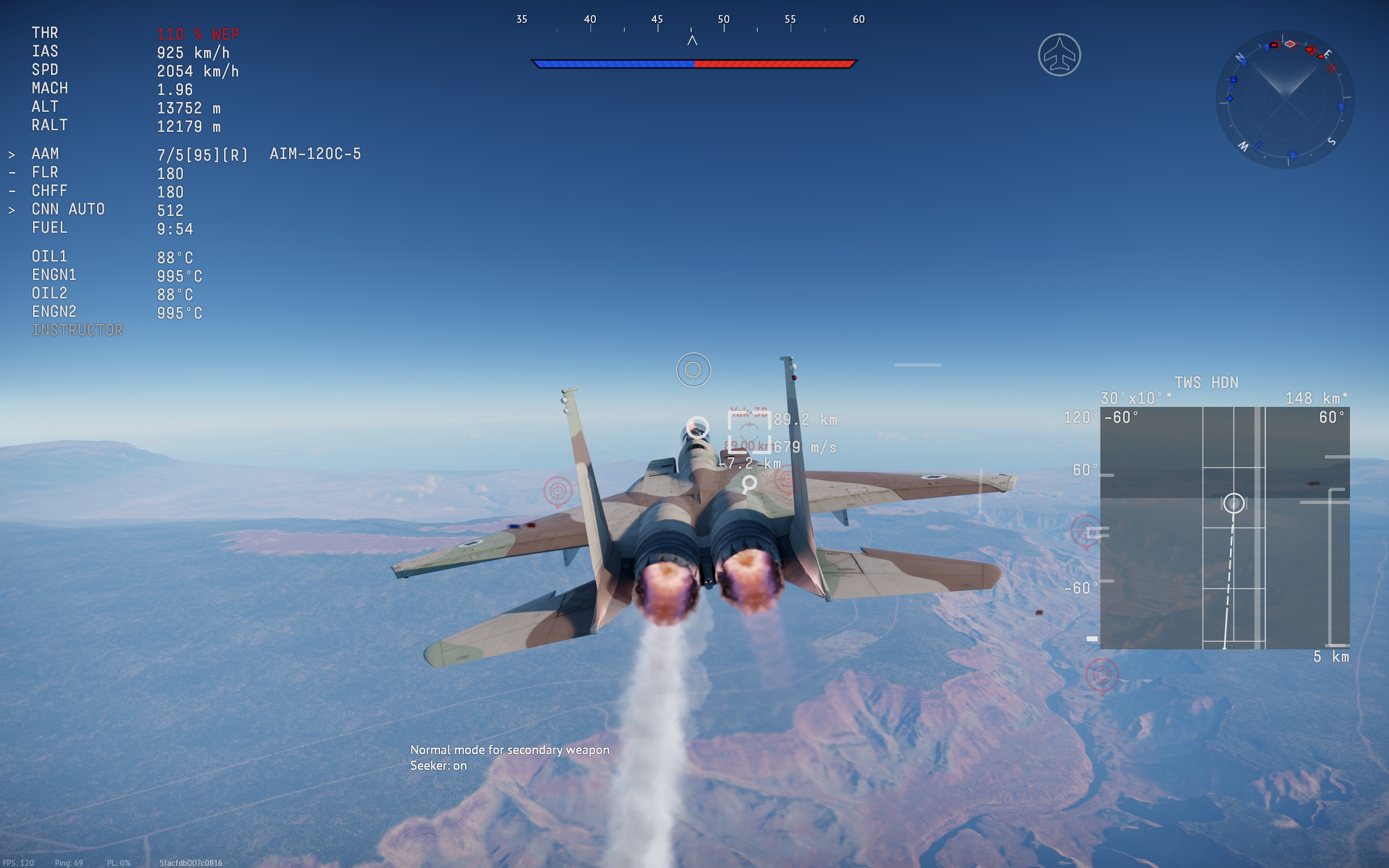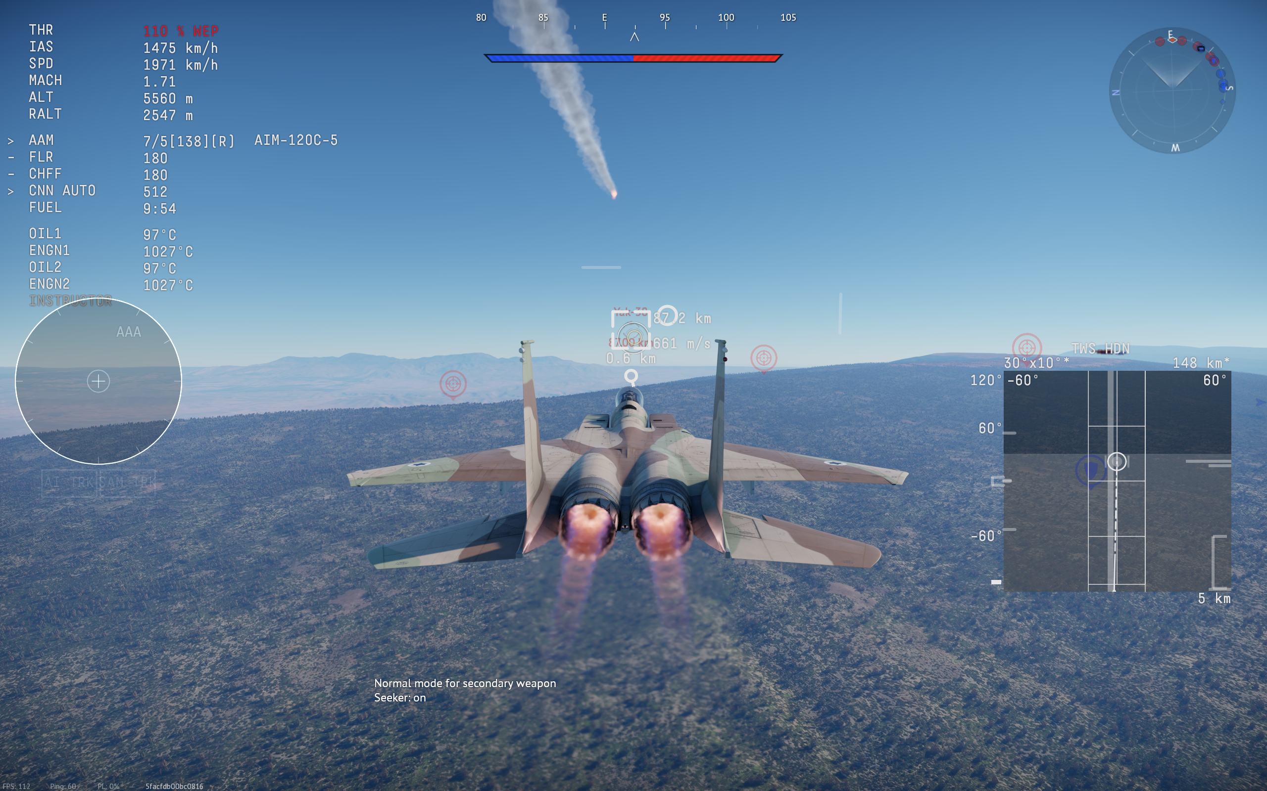 In more practical terms, Superhorny/Golden Egg radars don’t have enough range even when using HPRF/Head On to even try to make use of this extra reach. As extra insult to injury, Superhornet launched 120C5, at 1300kmh TAS, 10km alt and 90km launch distance against incoming Yak-38 at ±480kmh TAS (recon aircraft in Rocky Canyon EC custom battle) still had 1655kmh/1.47mach of speed just before impact, after expending 112/120s of battery time, traversing 78.4km with constant Snail Server grade overcorrections needlessly wasting speed.
