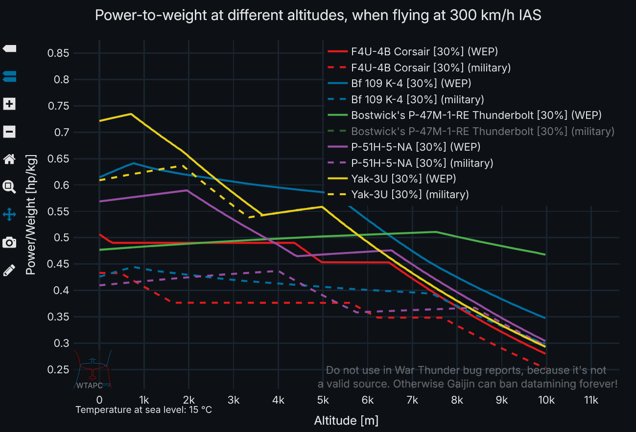 The Yak-3U absolutely CRUSHES the P-47M and F4U-4B to well past 5500 meters. It hammers the Bf 109 K-4 through ~2500 meters… and the nearly keeps up with it. For giggles, the P-51H-5 is on there… the “strongest/best prop in the game” at BR 6.3. I am not saying the Mustang isn’t good (and some would say it should be 6.7)… just a point of reference.