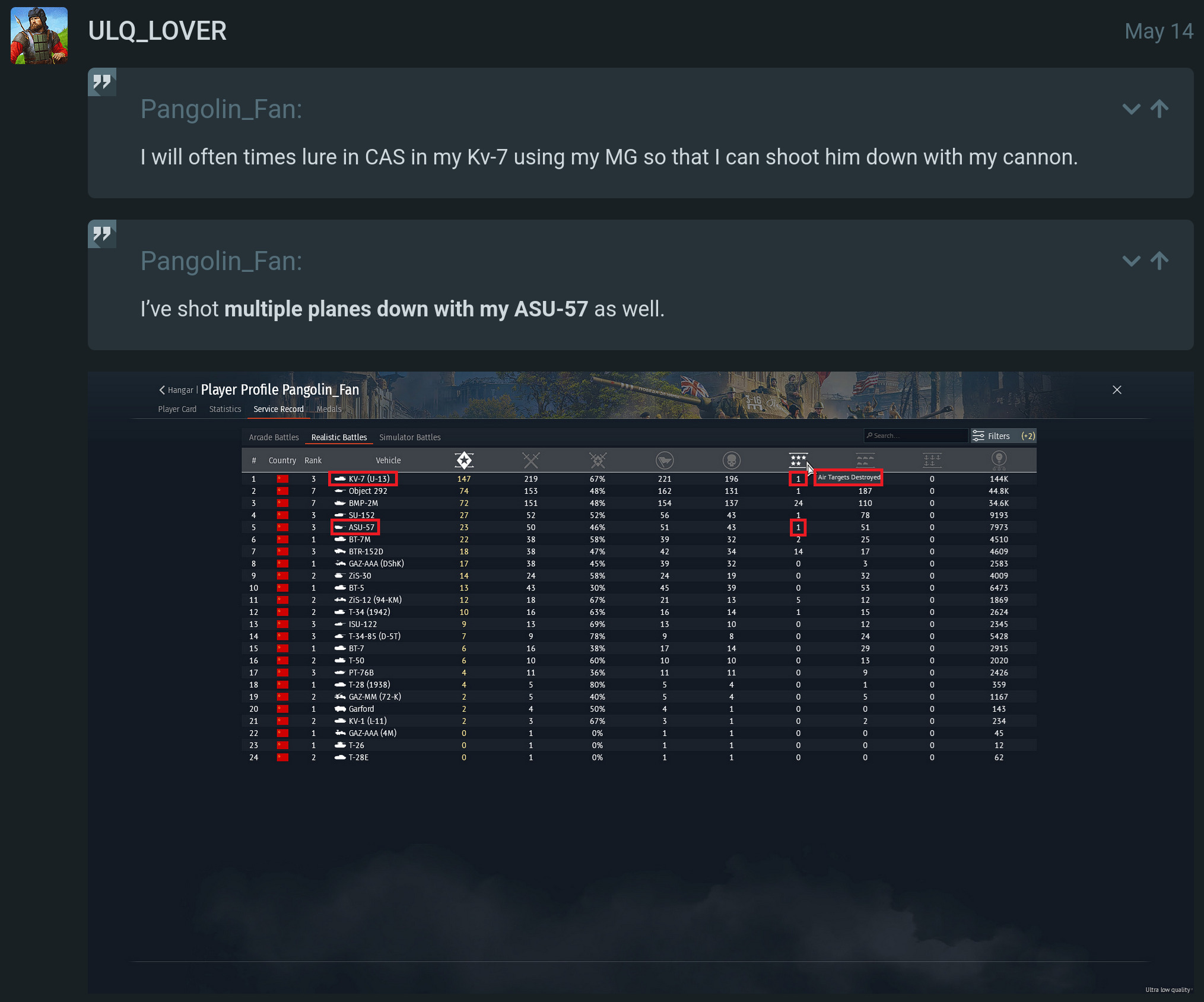 The same way you have multiple kills in the ASU-57 and you bait plane with the Kv-7 mg to shot them down with the main