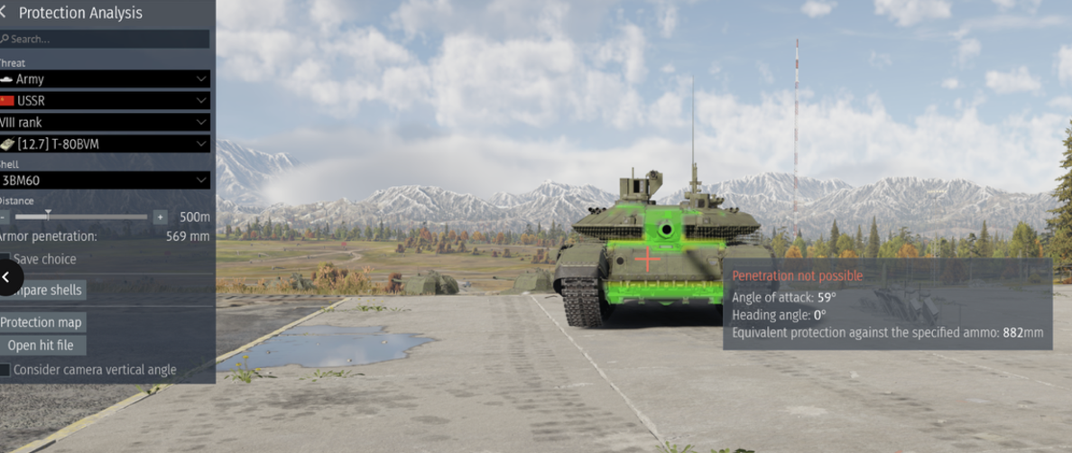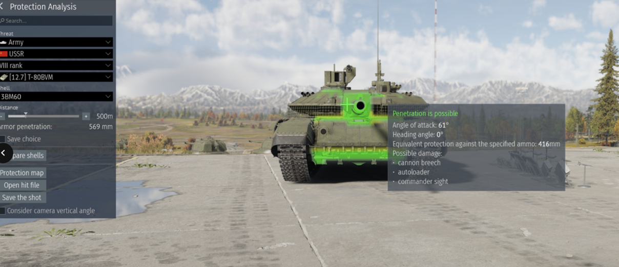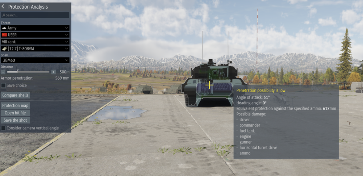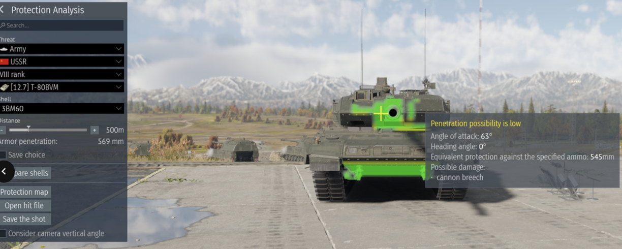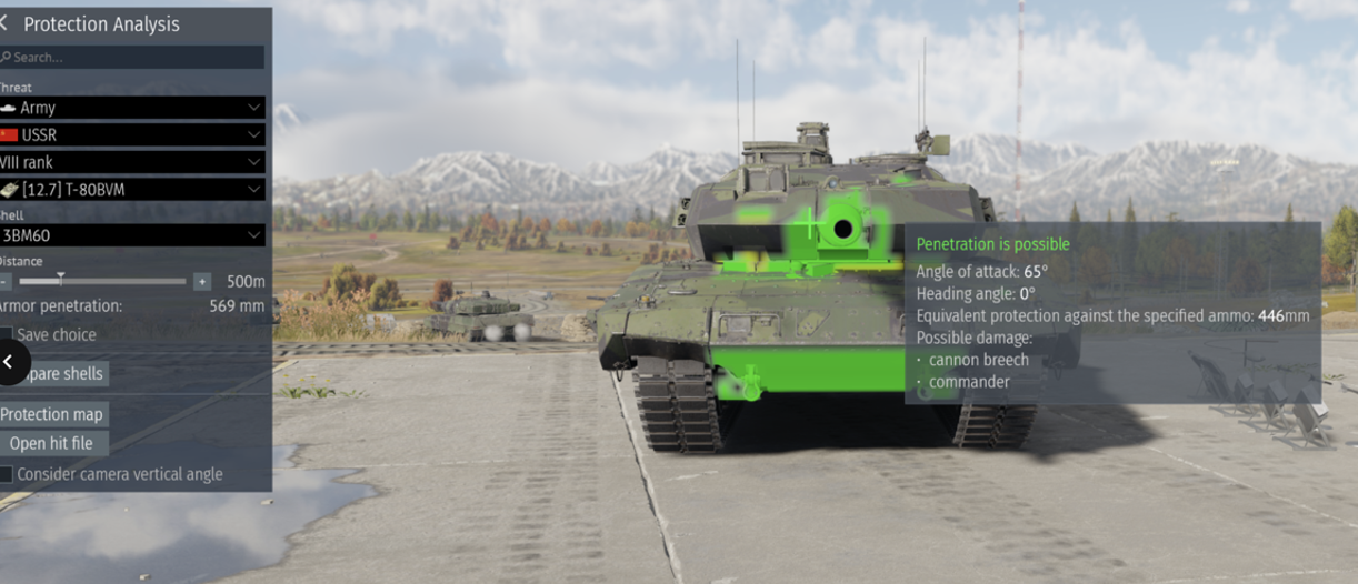 Round penetration (Highest APFSDS or another round if applicable) at 500m: T90M – 445 but it also gets an ATGM with 850, Leopard 2A7V – 641, M1A2 – 621, STRVB+ - 577, Al Khalid at a lower BR – 566, Challenger 2 – 558.