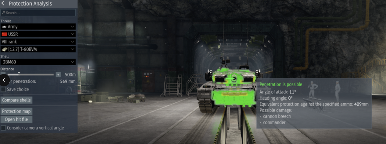 However, under the same conditions (Slightly right of the gun), the Swedish STRVB+ resists the same ammunition, with 446mm of armour. That’s a 230mm difference, and only the Cannon breech and the commander are knocked out, allowing the tank to safely drive away with three crew members remaining.