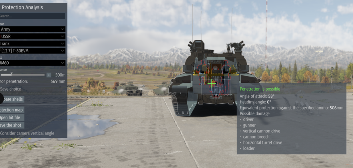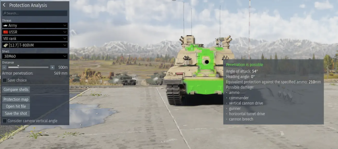 While precise armour specifications remain classified, in-game performance provides observable and testable outcomes. When comparing the Challenger 2 to other MBTs at equivalent BRs, notable differences in frontal protection emerge. For example, the gun breech. At 500m with the 3BM60 round, Slightly right of the gun barrel on the breech, the Challenger 2 has… 210mm of armour. It is completely knocked out from a single shot as the Commander, Gunner, vertical and horizontal drive, breach, and even the ammo is all knocked out. This would cause the vehicle to be ammo racked and die, and even if the ammo didn’t cook off you are missing half your crew, can’t replace your gunner for at least 25 seconds, and your repair is nearly a minute.