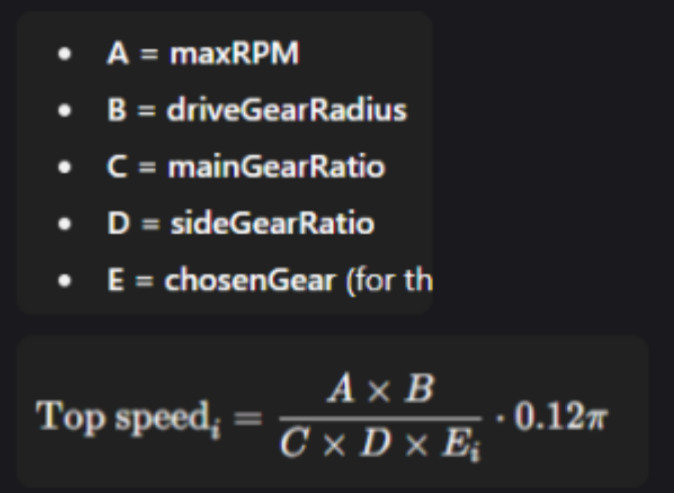 if the gear ratio of the top gear got increased by 10% a ratio somewhere else got reduced by 10% to keep the same overall (usually “mainGearRatio” and “sideGearRatio”, of which both serve the same purpose so it doesnt matter what chagnes, but “sideGearRatio” is meant to simulate the final drive