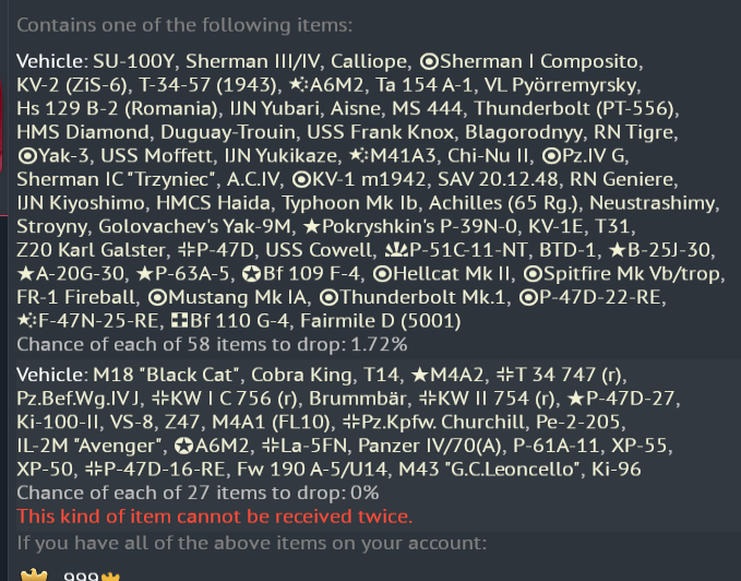 Always nice to see what is in those gambling crates. Looks like this time there is an actual chance of 0% to get one of the 27 items mentioned (see screenshot).
