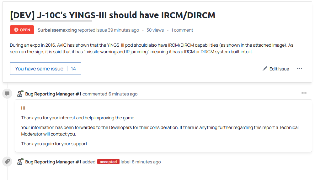 Here’s my bug report about the 10C missing IRCM/DIRCM that the YINGS should provide