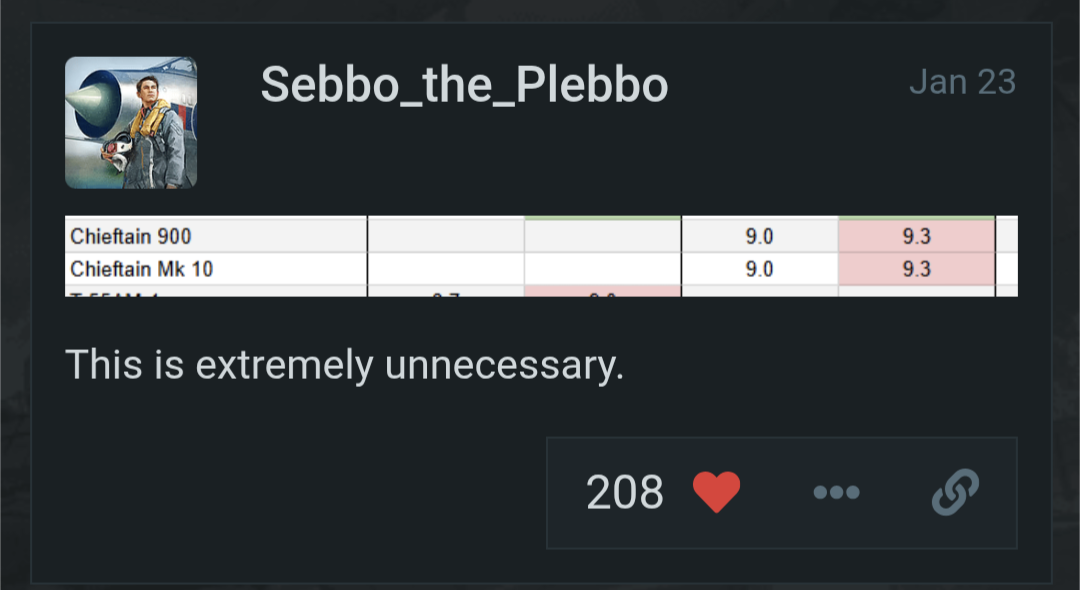 However no other nation has a 9.0 tank thats got as much of a unique niche fanbase of the Chieftains. Its all just pattons, leopards and whatever soviet stuff was passed around at that BR