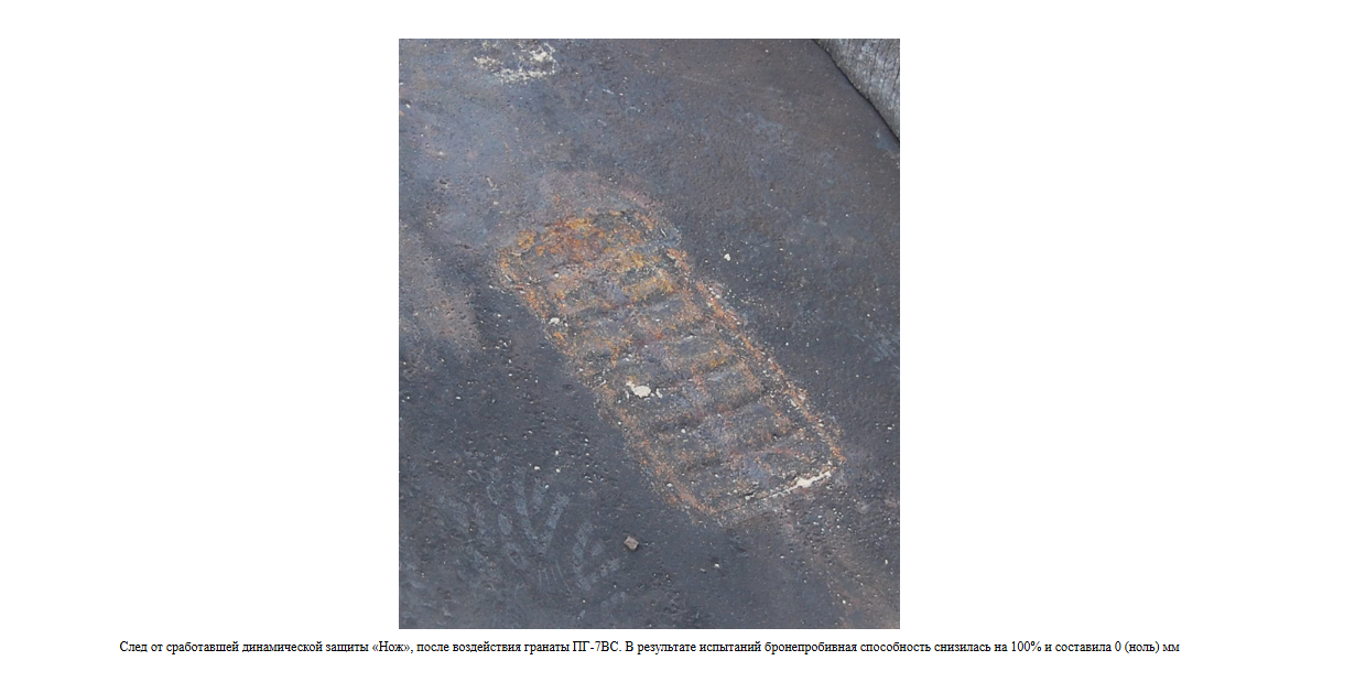 (Impact characteristics on the plate after being hit by 3BM42 APFSDS, with visible traces of the “Nozh” ERA activation)