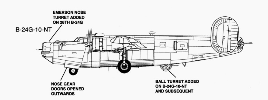 The B-24G-10-NT, the focus of this suggestion, was a significant improvement over the earlier blocks. It introduced two major changes: a Sperry power-operated ball turret replaced the earlier ring-mounted ventral gun, improving defensive coverage; and the original engines were replaced with Pratt & Whitney R-1830-65s that boosted the performance, allowing the aircraft to carry a maximum bomb load of up to 12,800 lbs.
