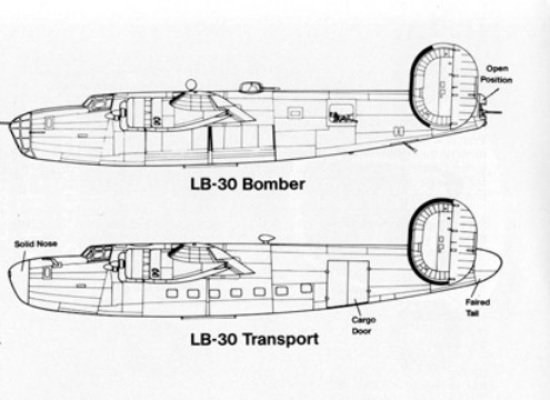 Under this revised contract, the first six YB-24 airframes were completed to British specifications and delivered as LB-30As, which were assigned to Ferry Command for use as long-range transports. These were operated by British Overseas Airways Corporation crews on transatlantic routes. The American equivalent, the B-24A, was also used for similar transport purposes.