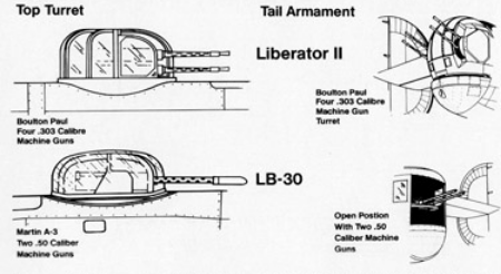 Once in US hands, the aircraft were modified with American equipment and weapons. The RAF-specified Boulton Paul power turrets were replaced: a powered Martin turret armed with twin .50 caliber machine guns was installed in the mid-upper fuselage, while the tail position was fitted with a pair of hand-held .50 caliber guns. Additional single .50 caliber guns were mounted in the waist positions and the nose. In total, the modified LB-30s carried eight 0.50 caliber machine guns.