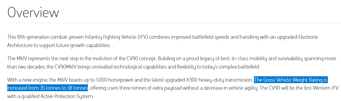 Anyway, the CV90 MK IV should certainly weigh less than 37t solely due to using rubber band tracks;