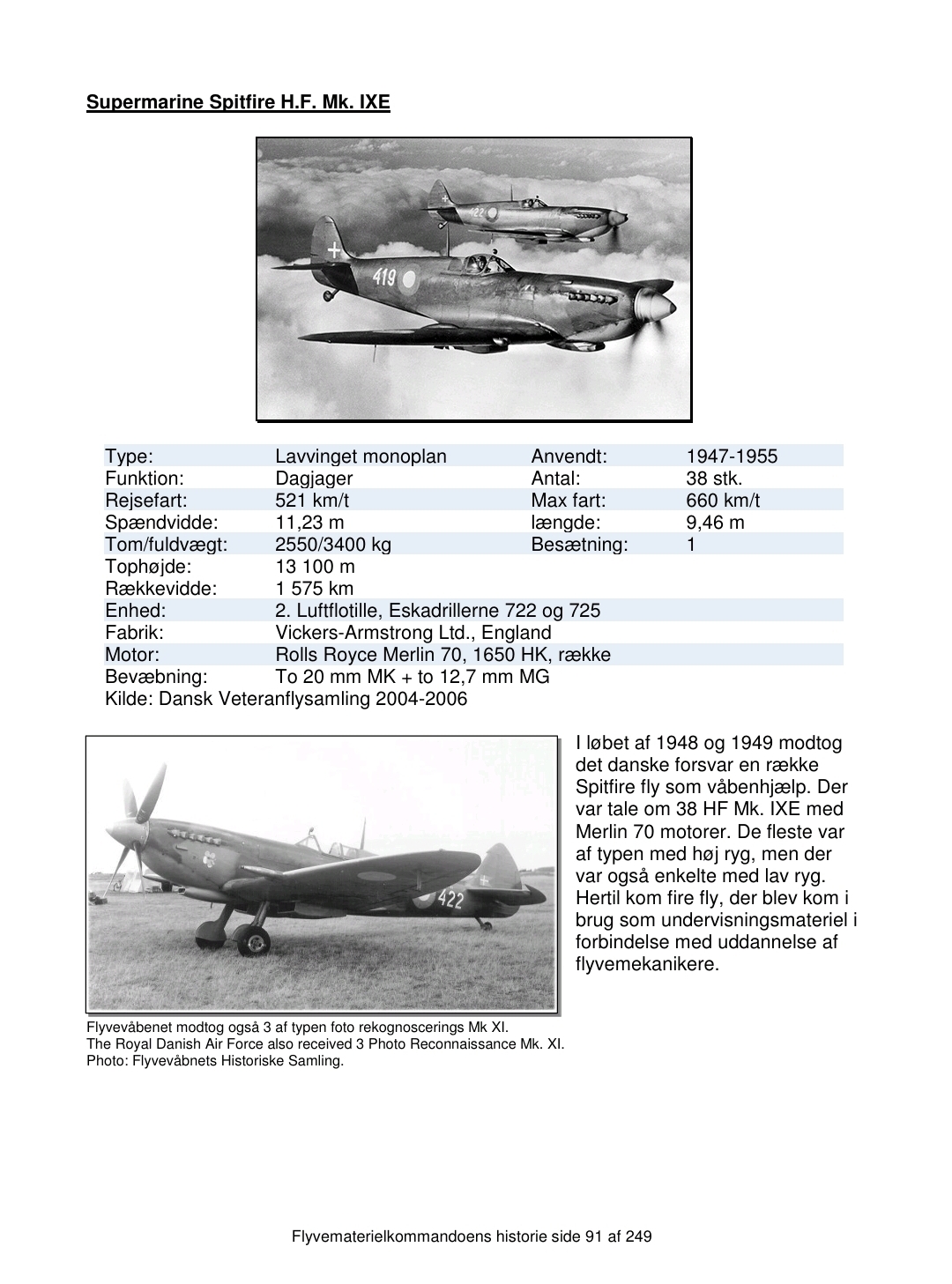 The Danish Spitfires were primarily used as trainer aircraft for new fighter pilots and served mainly with 2nd Air Wing, especially squadrons 722 and 725 at Værløse. The PR Mk. XI machines were painted grey-blue, while the Mk. IXE fighters included both high-back and a few low-back versions, some capable of carrying 90-gallon long-range tanks.