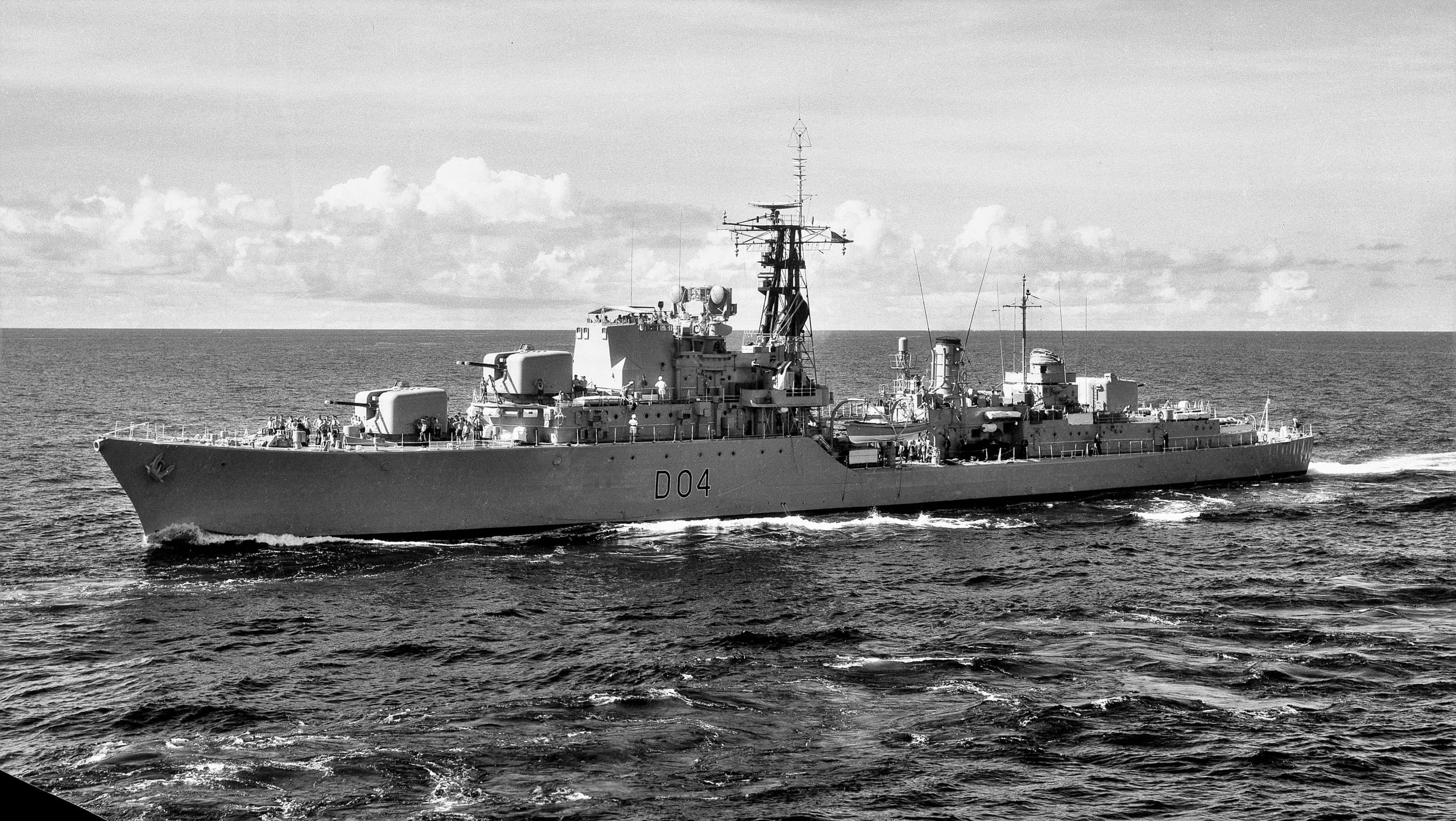 The first of the Australian Daring-class destroyers ordered in 1946, HMAS Voyager was laid down in 1949 at the Cockatoo Island Dockyard. Of the three completed Australian Darings, Voyager was the only one built to the same general design as the British Darings, though with modifications for the Australian climate and the integration of a Limbo ASW mortar at the stern. Construction was protracted because of labour and material shortages, and it was launched in 1952 to great fanfare. It was completed and commissioned only in 1957, and after a trialing period of about a year was deployed to the Far East Strategic Reserve. Despite tensions in Asia, Voyager did not see any action. It returned to Australia in late 1958 where it underwent a refit, before then participating in the SHOP WINDOW demonstration to parliament and the media off Sydney. Afterwards it served again in the Far East Reserve, once again participating in naval exercises.