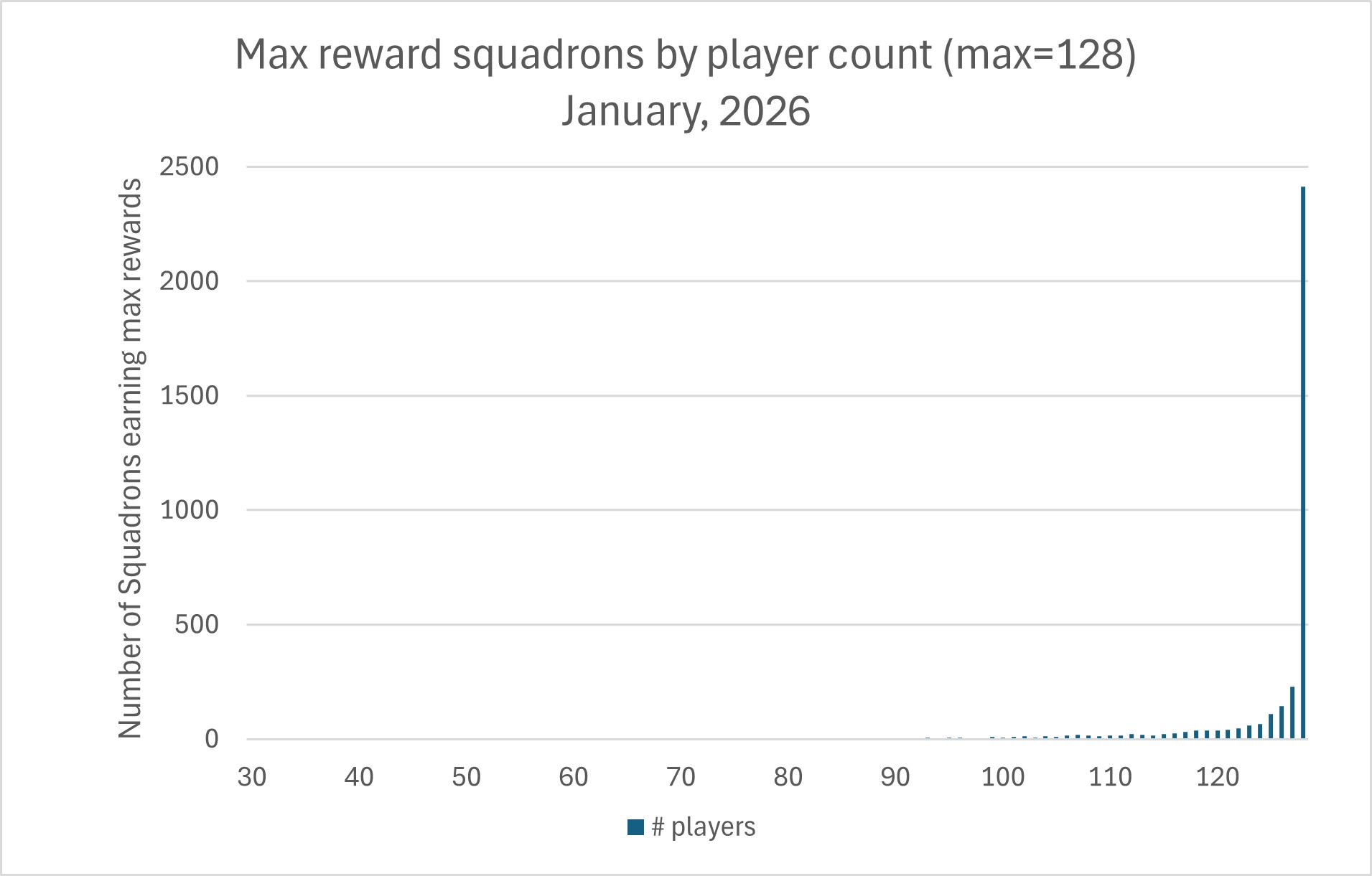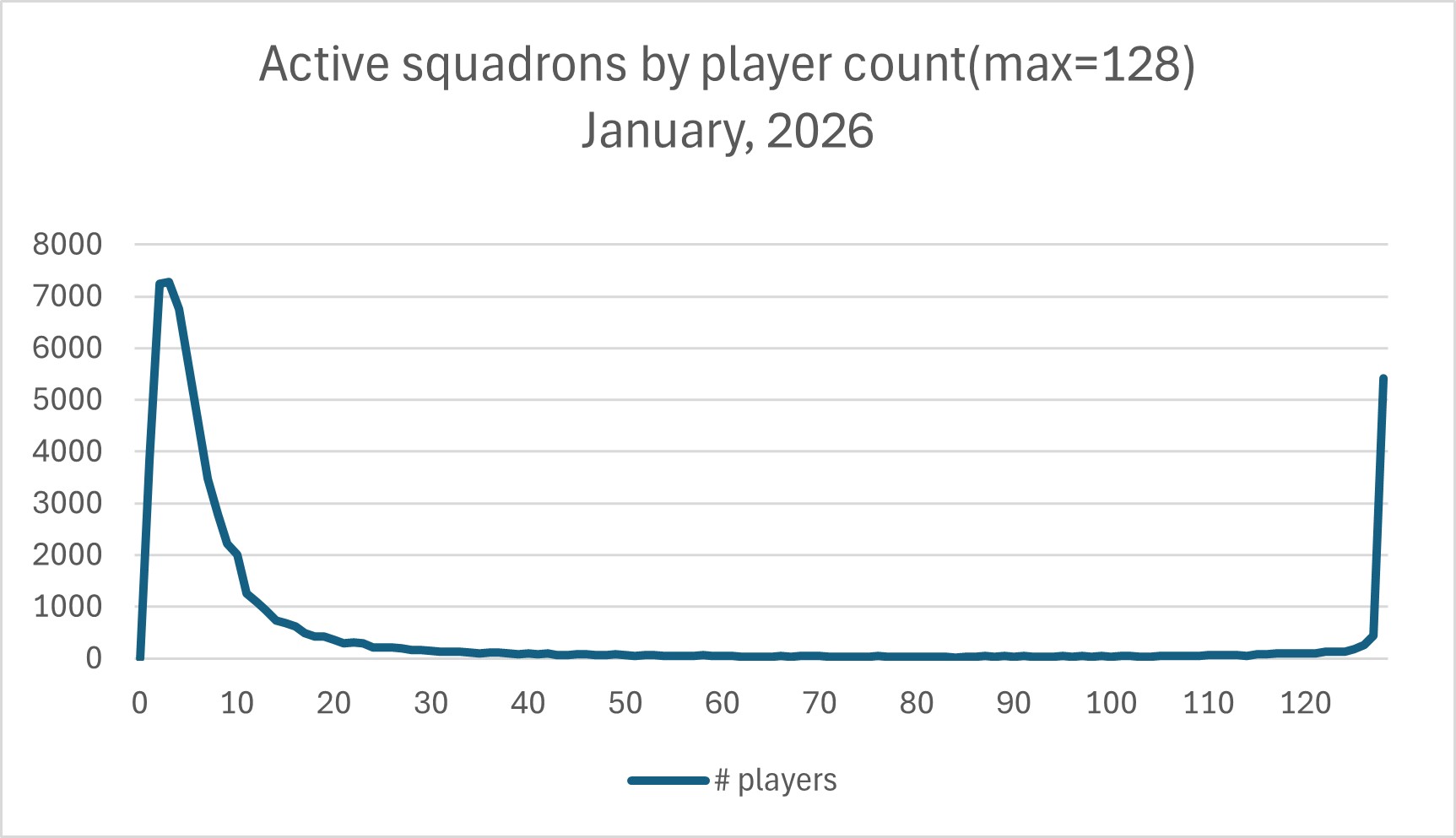 The distribution of players between the maximum 128 and 0 in active squadrons is strongly bimodal (see following graph) with over 50% of squadrons with 1-6 players and a large number (5,414, or 8% of active squadrons) with all 128 slots filled.