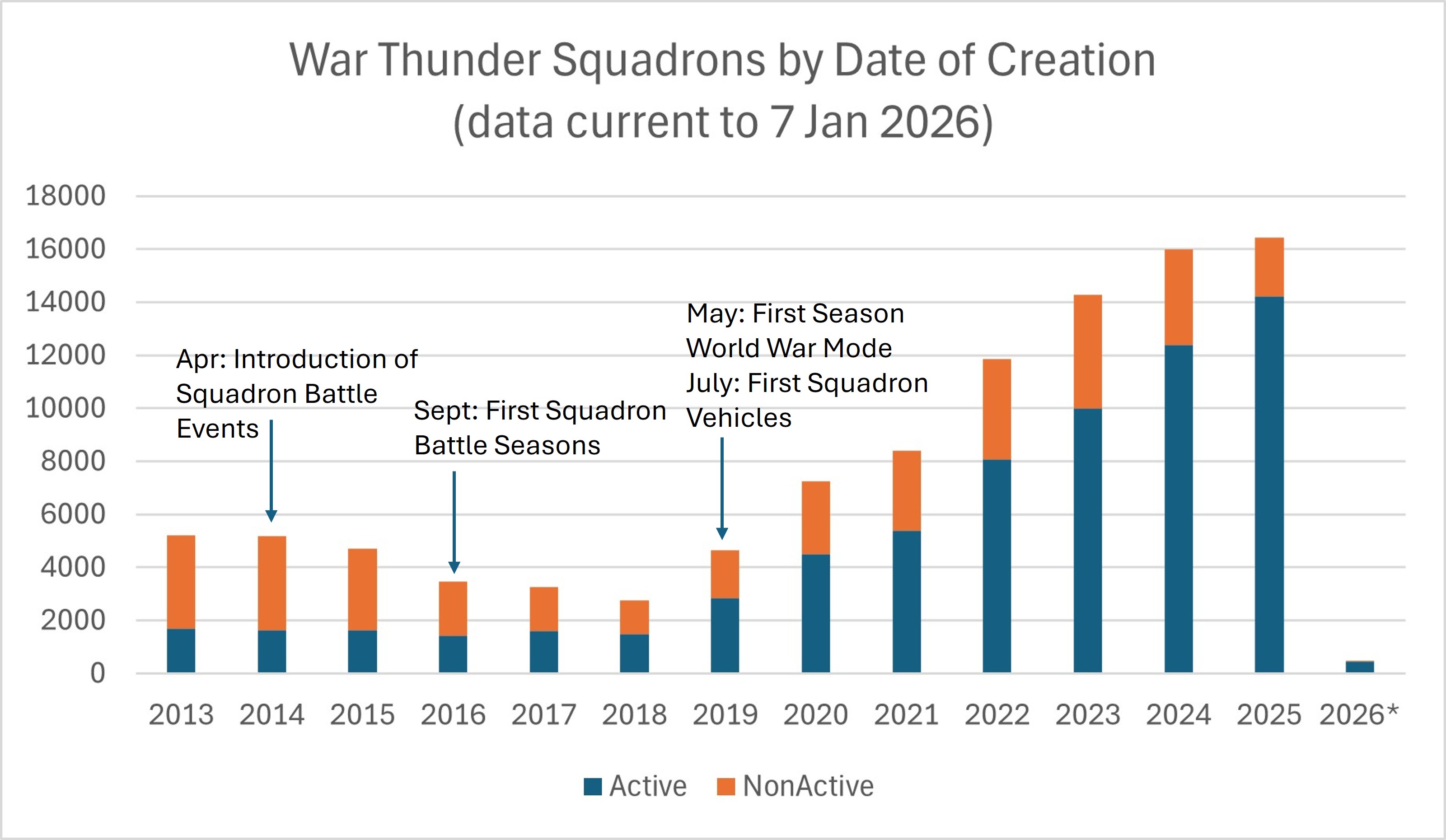 In the first six months of War Thunder squadrons in 2013, new squadrons were being created at the rate of 28 a day, slowing to 7 by 2018. This then ramped up to today. In 2025, an average of 45 new squadrons being registered daily.