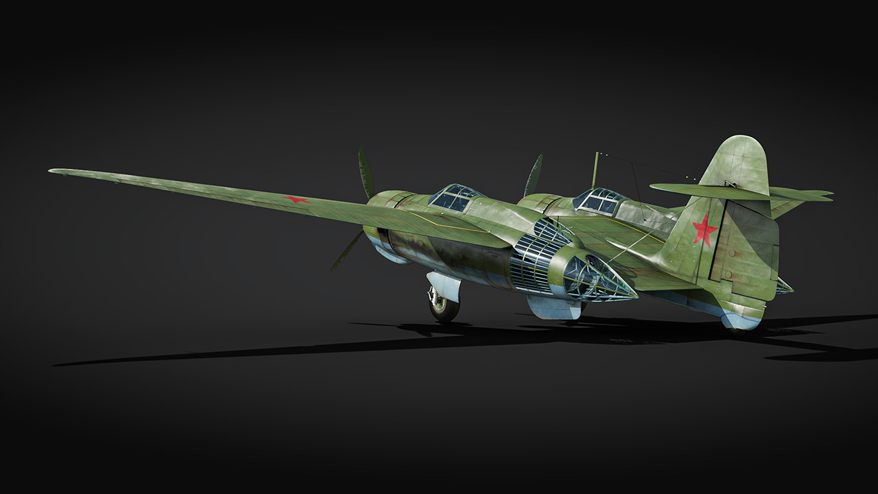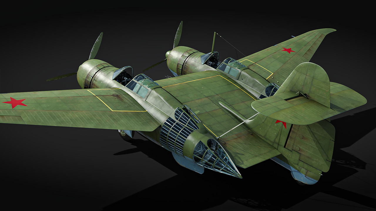 The DB-LK is a twin-fuselage bomber with two cockpits, which is quite a rare setup overall. One cockpit is set up for the pilot, while the other houses the navigator/bombardier. It uses a pair of M-87B engines, which accelerate this green wing to a respectable speed for such an early bomber.