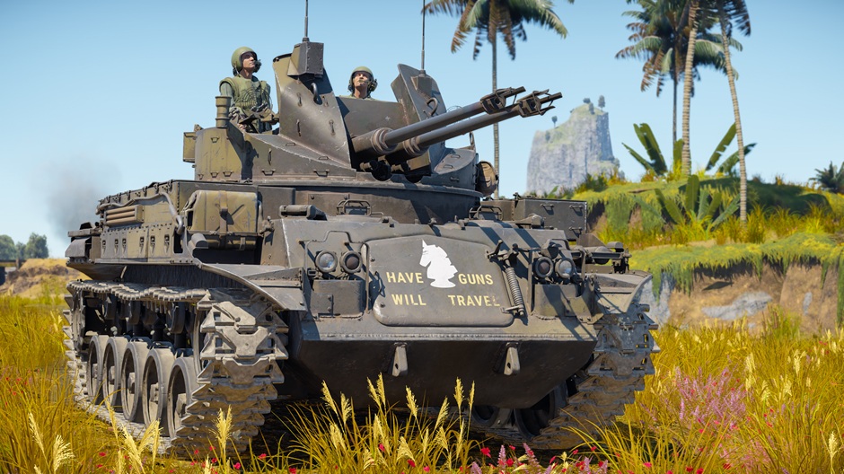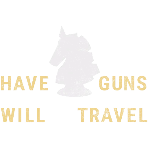 “Have Guns Will Travel”, armée américaine. Marquage largement utilisé sur les véhicules américains pendant la guerre du Vietnam, inspiré de la série TV des années 1950 “Have Gun – Will Travel”. Le protagoniste utilisait une carte de visite avec une pièce d’échecs et l’inscription. Ce marquage est apparu sur de nombreux M48, puis adapté en “Have Guns Will Travel” par les unités d’artillerie antiaérienne pour les véhicules multi-canons, souvent sur la trappe avant des M42 Duster.