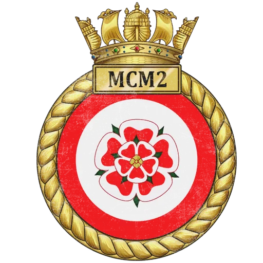 Emblème du 2nd Mine Countermeasures Squadron, Royal Navy. Formé en octobre 1962, équipé de dragueurs de mines de classe Ton, puis de classe Hunt dans les années 1990. L’escadron a participé à diverses missions de déminage et de sauvetage pendant la guerre froide et opère régulièrement dans le golfe Persique et avec l’OTAN. Son emblème représente la rose Tudor, symbole d’union et de paix, souvent peint sur les cheminées des navires.