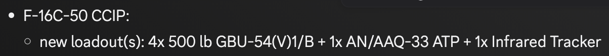And then finally, are there any more updates regarding the GBU-53? I remember it being pretty much denied for now, but I’m curious if anything has come up that might change that. It would be very nice if the US got a new CAS weapon, especially one that could be used with PIDS+ pylons (unlike the 3x AGM-65Ds).