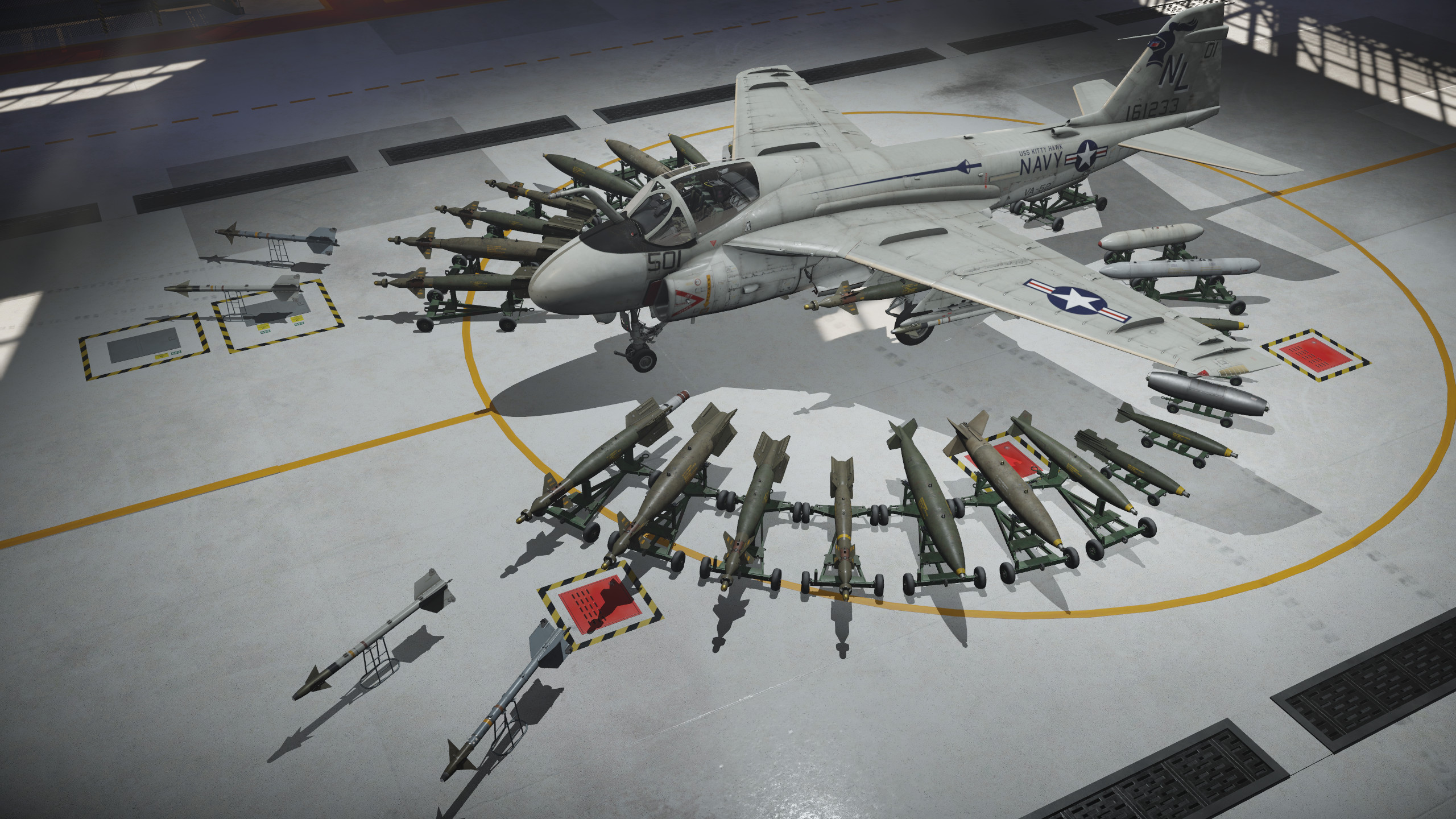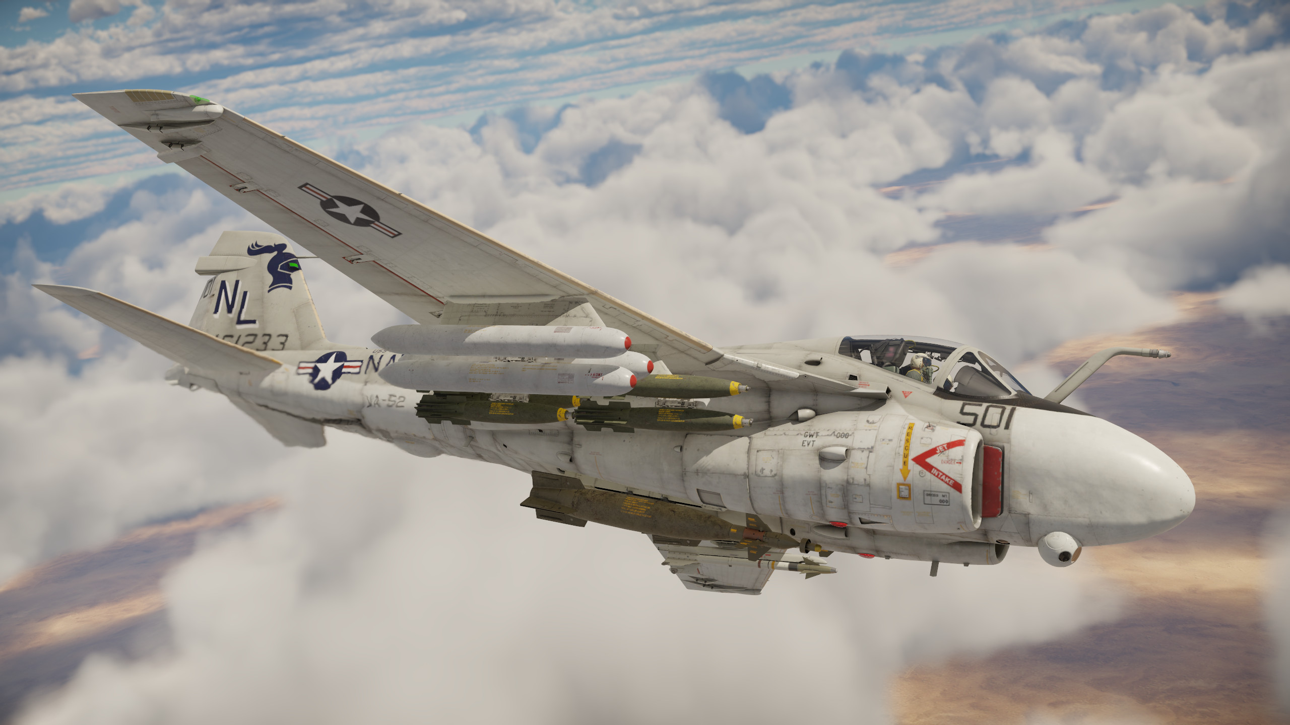 - Die A-6E TRAM Intruder verfügt ausschließlich über externe Bewaffnung, doch die Vielfalt ist beeindruckend! AIM-9G- und AIM-9L-Luft-Luft-Raketen, Zuni Mk32 Mod 0 ATAP- und Mighty Mouse-FFAR-Raketen, AGM-123 Skipper-Anti-Schiffslenkwaffen, Brandbomben sowie gelenkte und ungelenkte Bomben aller Typen und Kaliber machen sie für jede Mission geeignet. Wählt eure Bewaffnung und vernichtet eure Gegner, wo auch immer sie sich befinden!