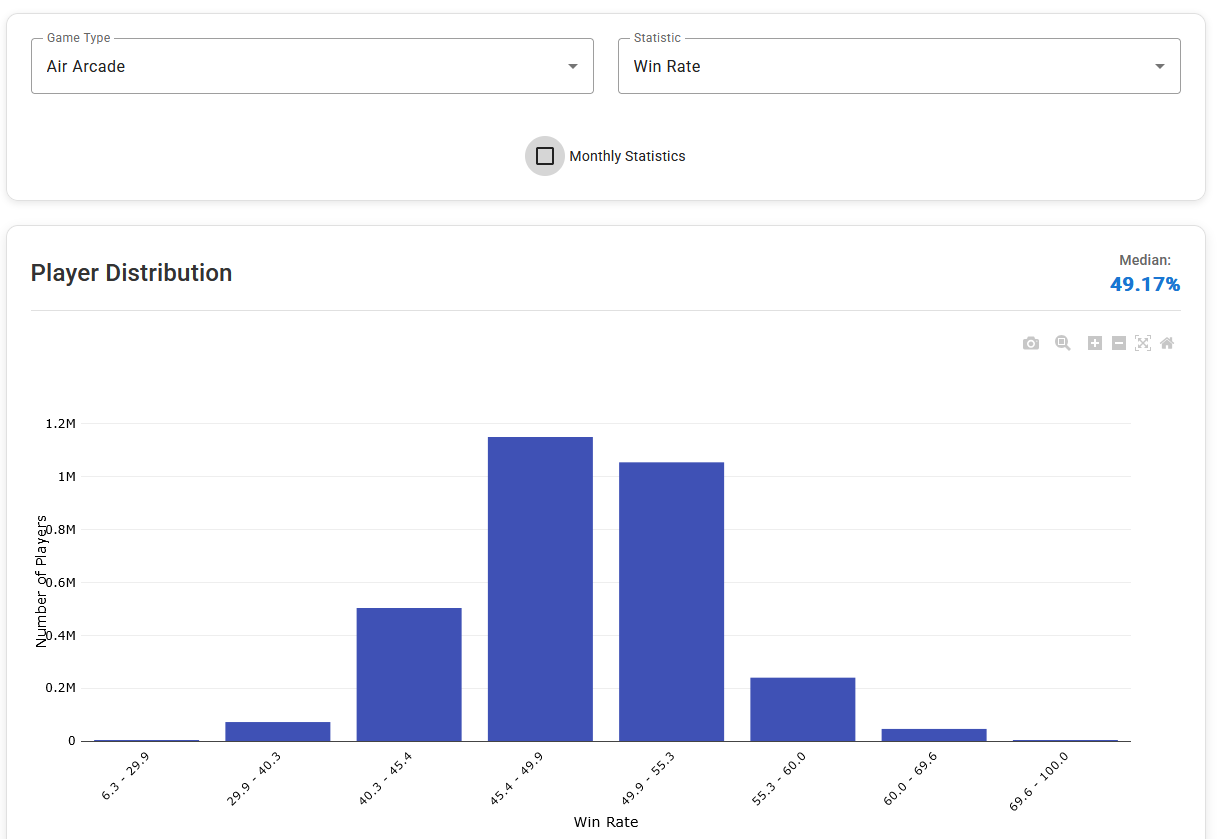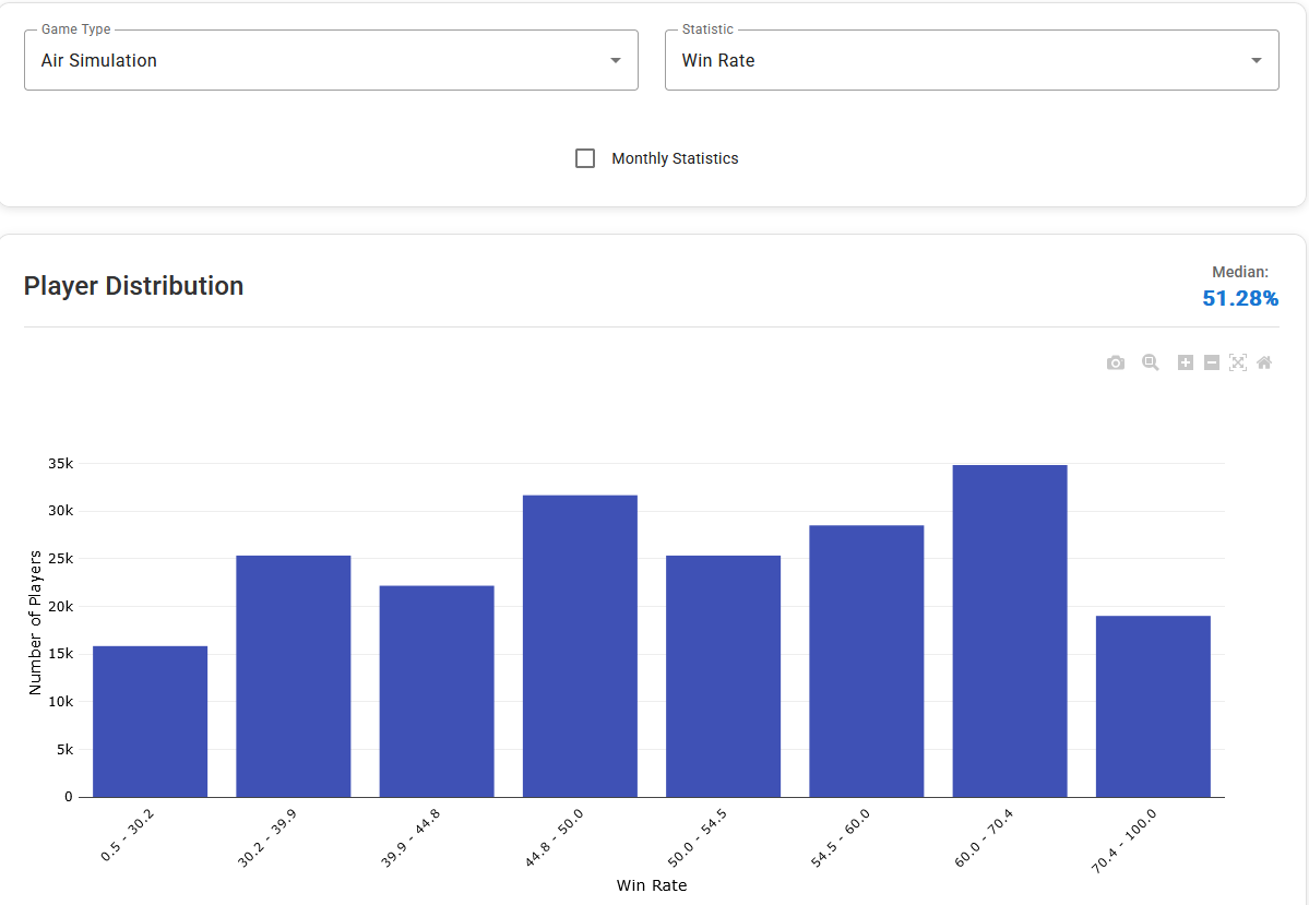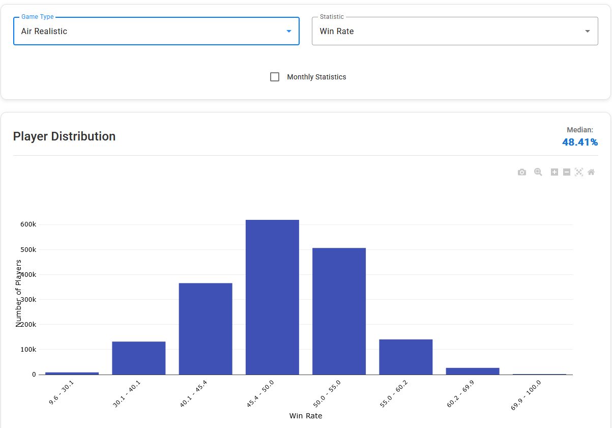 Both AB and RB follow a gaussian distribution, which is what we expect, while sim follows a somewhat even distribution. This can be due to the nature of the mode as well as to the low player numbers (several million in both RB and especially AB, while about ~200k in sim).