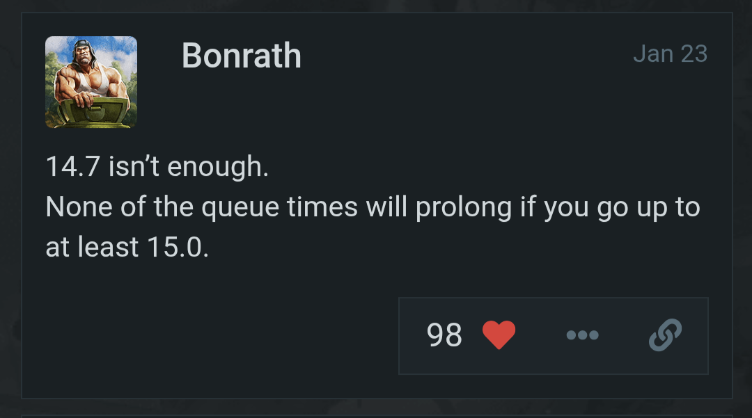 Not only would this improve player moral and keep the matchmaker working quickly, this would also artificially help with BR compression. If people think there is some merit to this idea, I’ll put together a more formal proposal in suggestions.