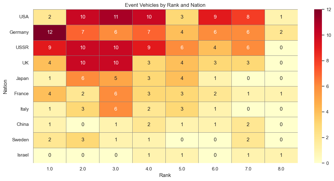- Germany and the UK show a more even distribution across ranks 2–7, with Germany heavily represented in rank 1 vehicles, which is a legacy of the first styles of events, where low rank (1-2) vehicles were prevalent as a first vehicle before the main reward.