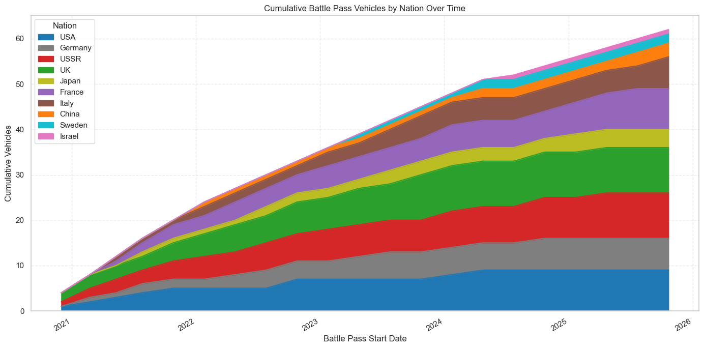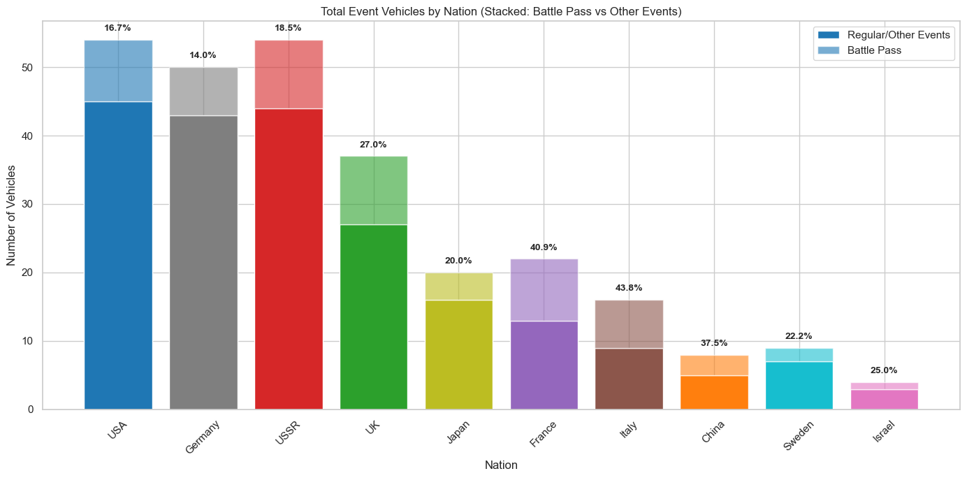 - Even smaller nations like China and Israel show meaningful Battle Pass representation (37.5% and 25%), suggesting that Battle Passes provide an alternative way for event vehicles to reach their sparsely populated event vehicle collections.