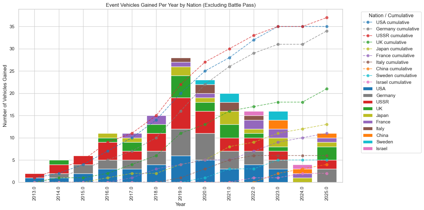 Inspired by @Bruce_R1 's Data Analysis series, I dived into War Thunder event vehicles to know more about their distribution, I analysed all vehicles available through Battle Passes, seasonal events, and other special events which occured from the start of War Thunder until the 31st of December 2025 (this includes vehicles given as throphies for tournaments and Cups, even though they were only availabe to a select few elite players). Most of this information was aquired through the War Thunder wiki, whilst checking data against @_Poul 's vehicle data used for How the total vehicle costs have changed in War Thunder (2020–2025).