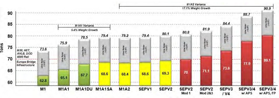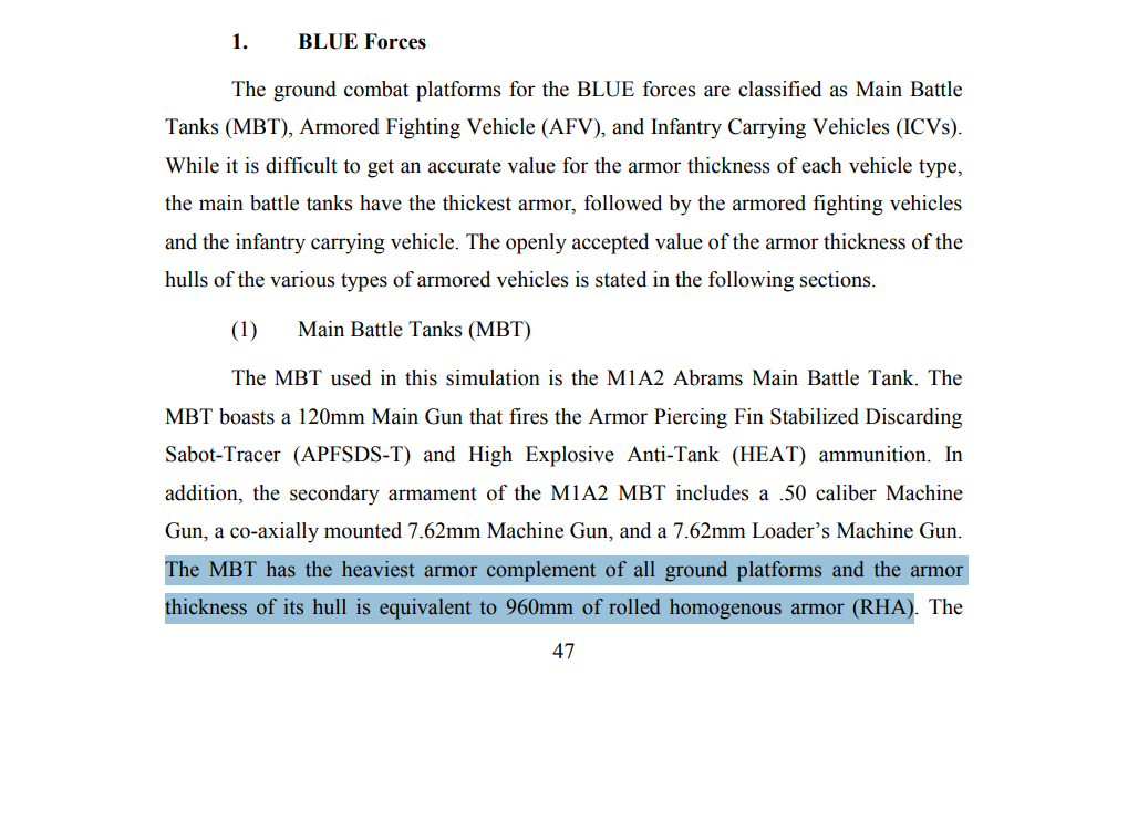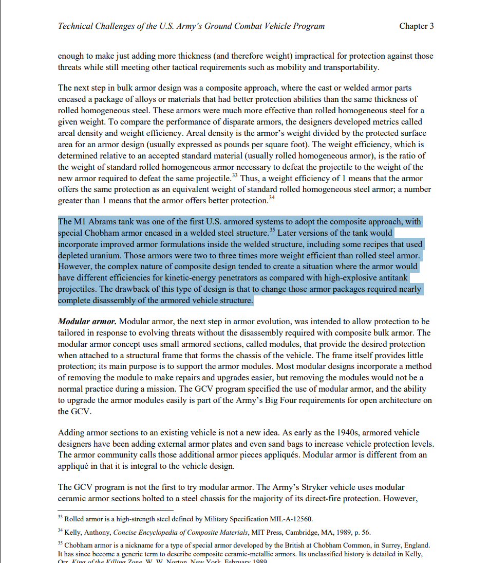 This figure is consistent with the massive weight increase of the M1A2 (~5–7 tons heavier than the M1A1) and the mass efficiency of DU. Another DTIC report (ADA591460 ) notes that these armors are “two to three times more weight efficient than rolled steel,” which explains how a ~650mm physical cavity can provide ~960mm of protection.