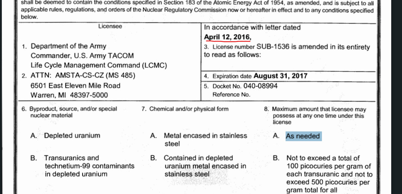 There is a common misconception that DU hulls were limited to “5 tanks at Army Schools.” This is based on an expired 2006 NRC application. That limit is legally obsolete.