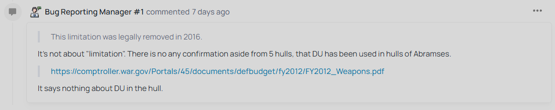 Gaijin dismissing these sources previously does not change the literal text of the documents. Those older developer responses rely almost entirely on the 2006 letter note about 5 hulls while ignoring the actual legal reason the NRC removed that limit. The 2012 NRC review explicitly states that possession limits were deleted because the number of tanks and parts is classified information and changes frequently.