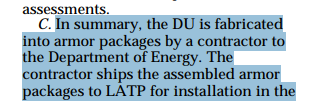The fact that the General Dynamics license only mentions turrets is irrelevant. The Federal Register explicitly states in Section 2, Paragraph C that the DU is fabricated into armor packages by a contractor to the Department of Energy and then shipped to the plant for installation.