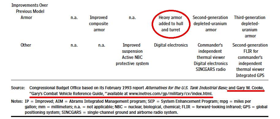 Fourth problem, the first source that’s quoted in the CBO report dates to 1993 and it makes no reference to DU hull armour anywhere, it also makes it clear that the M1A1 AIM addition comes purely from the ‘Gary’s blog’ source.
