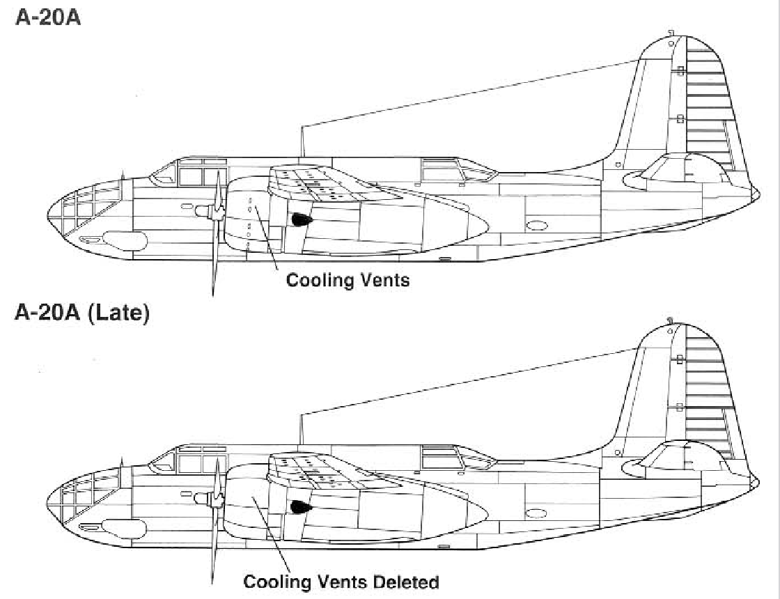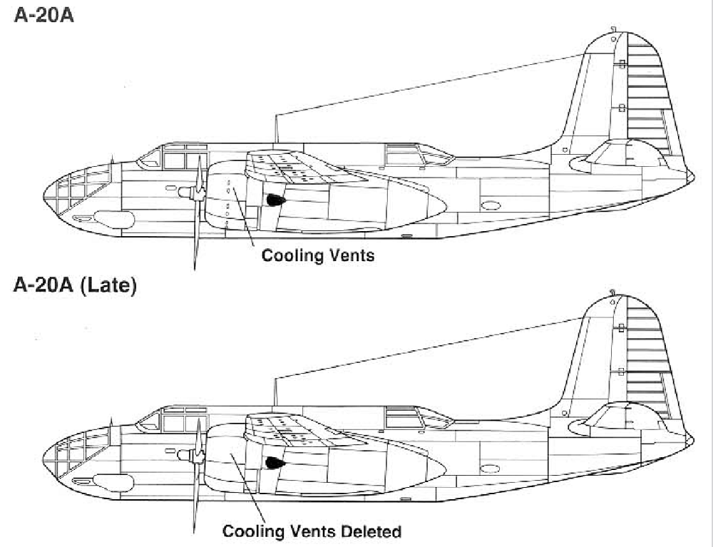 The first A-20A was completed in August 1940 and took to the air for the first time on September 6, 1940, ahead of the turbocharged A-20’s maiden flight. Deliveries to the USAAC began on November 30, 1940. The original order for 123 aircraft was later expanded by 20 more, bringing the total to 143. Early production models featured cooling vents along the engine cowlings, but these were eventually removed as they proved unnecessary.