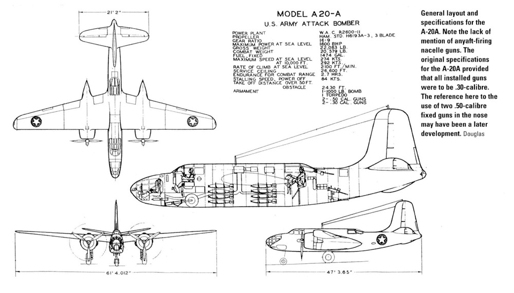 The A-20A closely resembled the A-20 in design but omitted the complex and bulky turbosuperchargers, instead using two-speed mechanical superchargers. Its engines were largely similar to those used on the French DB-7A and British DB-7B, each producing 1,600 horsepower at takeoff. Armament and bombload remained the same as the original A-20: four forward-firing .30-caliber machine guns, plus two defensive guns, one in a dorsal position and the other in the ventral rear.