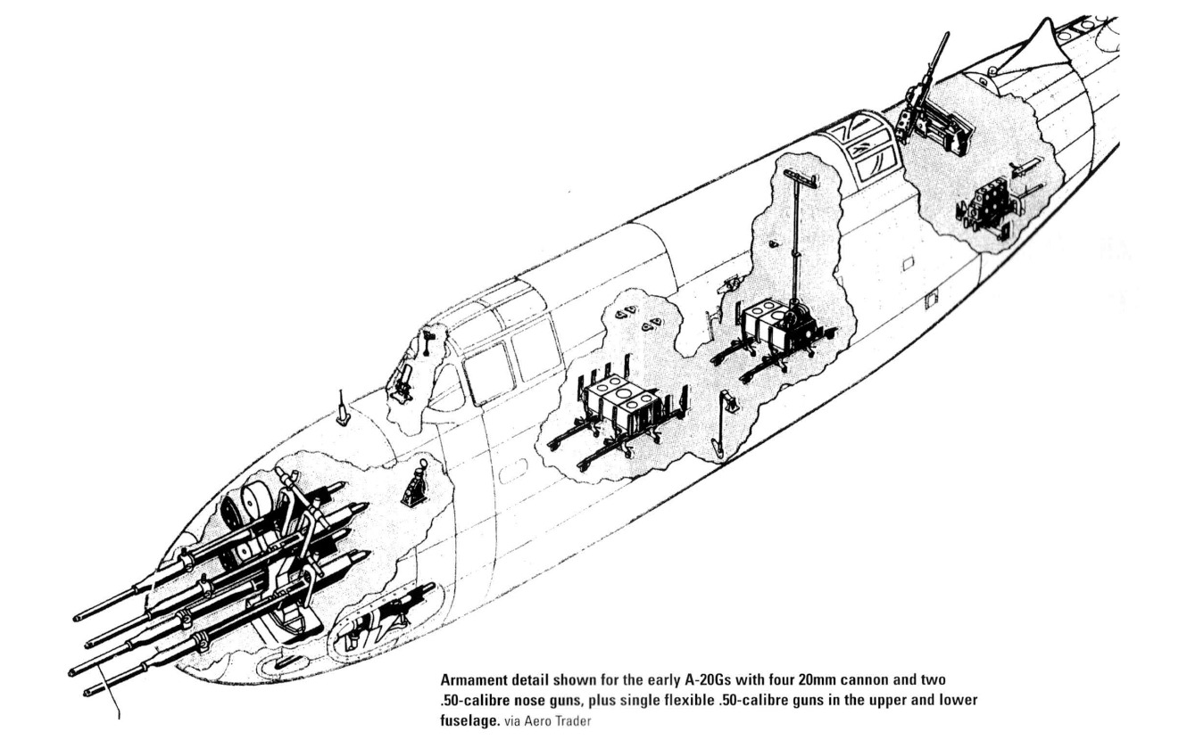 The A-20G was the most numerous and widely produced variant of the Havoc series. However, a lesser-known subvariant is that the very first production block, the A-20G-1, was fitted with a monster armament configuration: four 20 mm cannons and two 0.50-caliber machine guns mounted in the nose, making one of the most heavily armed attack aircraft of the A-20 family.