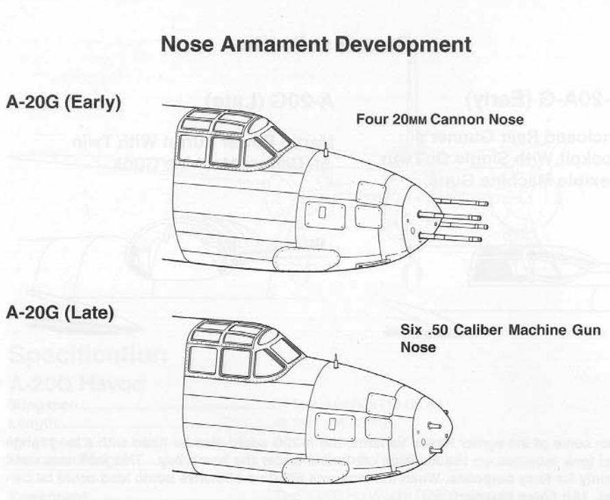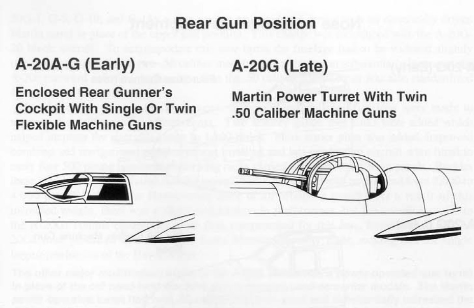 Only the first production block, the A-20G-1-DO, was equipped with the original nose armament of four 20 mm cannons and two .50-caliber machine guns. These early aircraft retained the manually operated single .50-caliber machine gun in the dorsal position. Later models (G-5, G-10, etc) would receive the electrically operated Martin 250E-CE-10 turret, capable of 360-degree rotation and 90-degree elevation, which significantly enhanced rear defense.