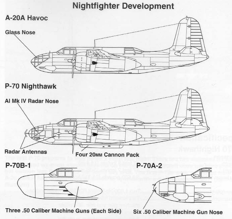 These early P-70s were powered by Wright R-2600-11 engines, the same used on the A-20A. Those were, however, not supercharged. Although the more powerful, turbo-supercharged R-2600-7 engines had initially been considered, they had already proven troublesome on earlier Havoc models. The oversight of high-altitude capability would prove to be a limiting factor for the P-70’s effectiveness in combat.