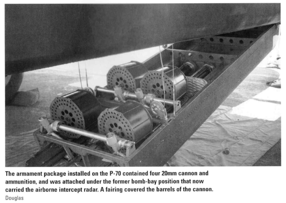 The P-70s were coated in matte black night camouflage with standard Air Corps markings, and their serial numbers were colored red. Internally, the aircraft underwent several major changes: the bombardier’s position and nose armament were removed, and the rear gunner’s position was converted into a radar operator’s station, eliminating the defensive guns and reducing crew from three to two. A 250-gallon fuel tank was installed in the bomb bay, which also housed a tray-mounted armament of four 20 mm cannons with 120 rounds each.