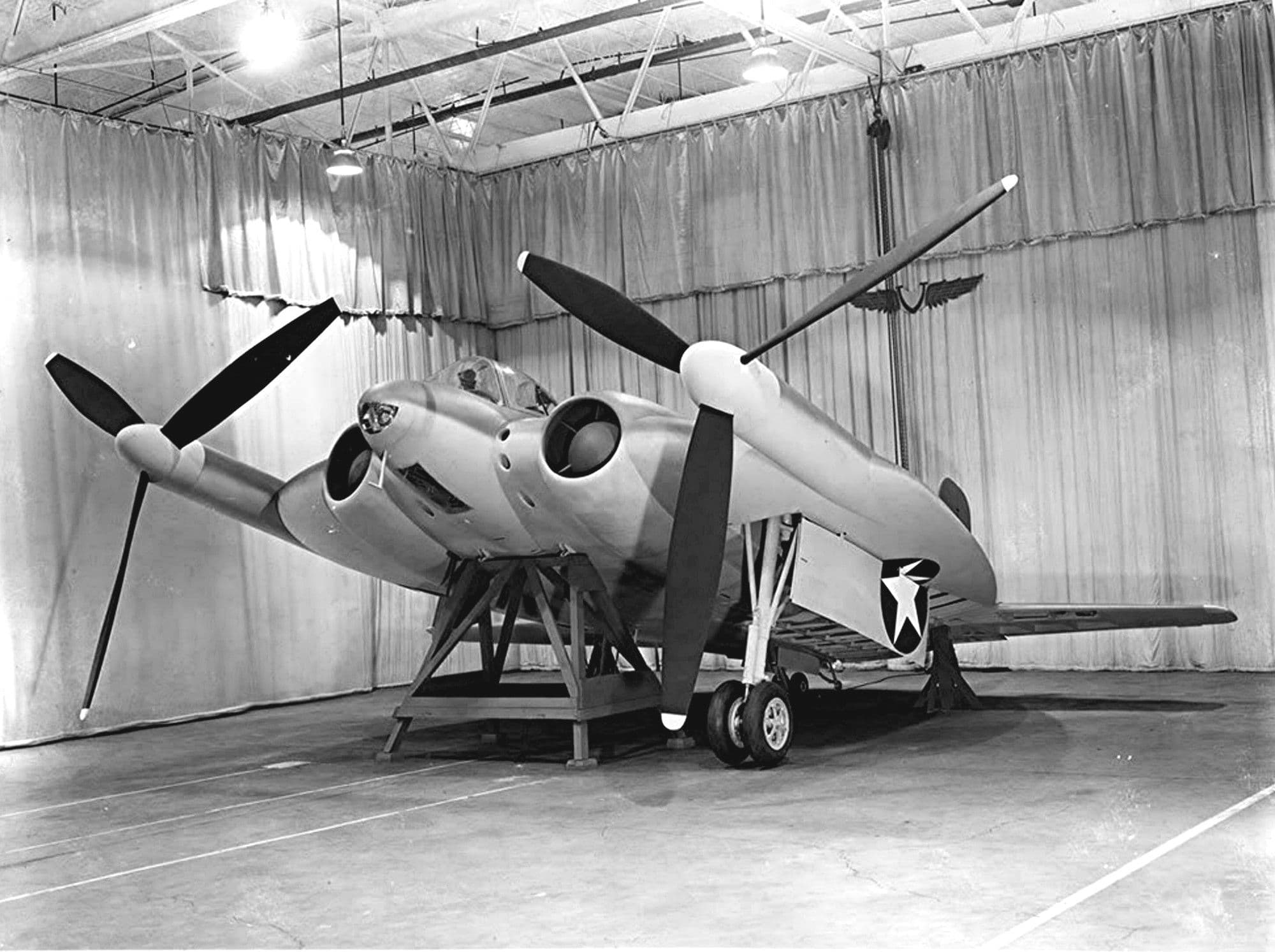 A wooden mockup of the XF5U was inspected by the Navy in June 1943. At this time, the mockup had narrow, three-blade propellers that were very similar to those used on the V-173. The XF5U’s complex systems and unconventional layout delayed its construction, which was further stagnated by higher priority work during World War II. The aircraft was rolled out on 20 August 1945 with the F4U-4 propellers installed. Some ground runs were undertaken, but more serious tests had to wait until Vought finished the special articulating propellers in late 1946.