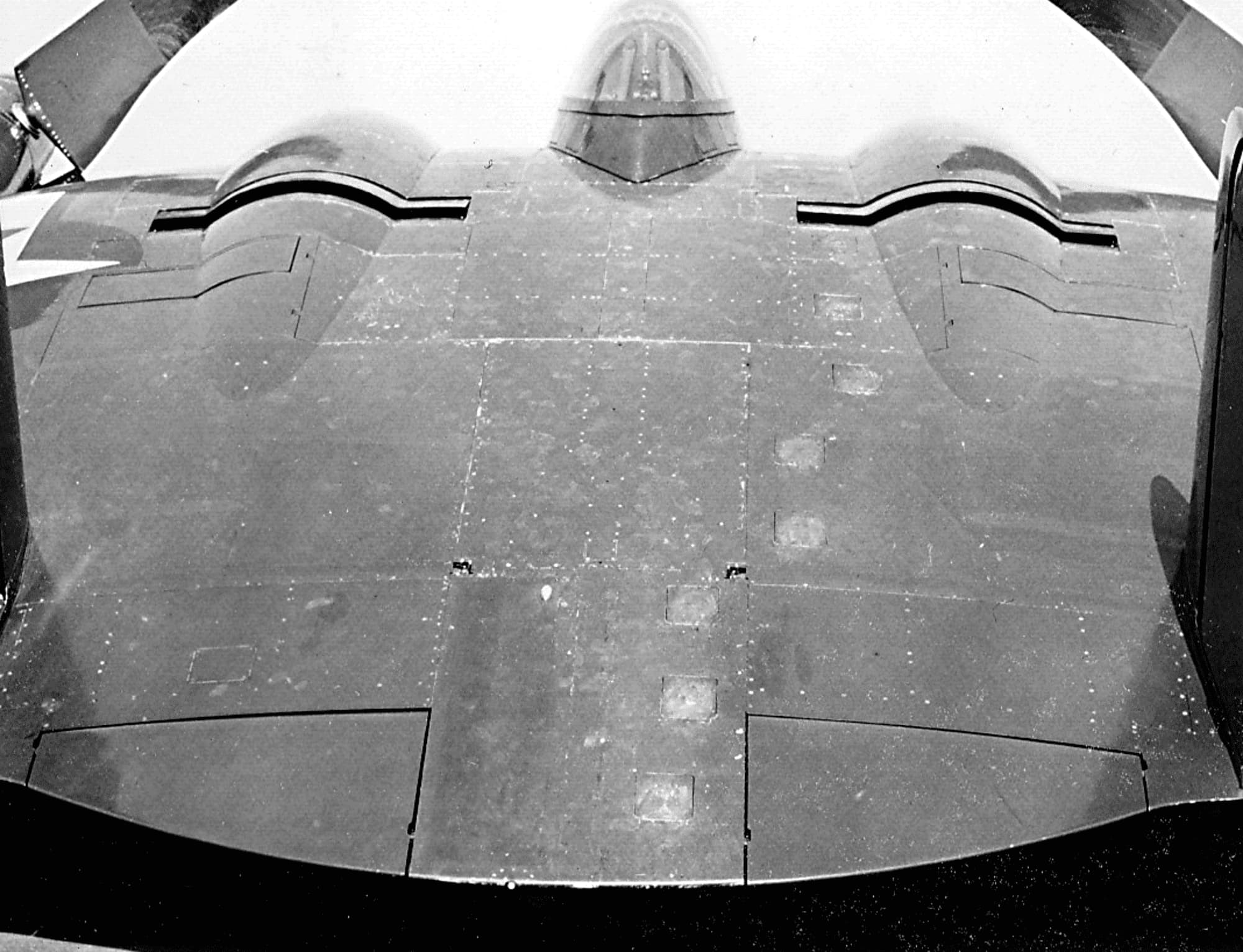 Originally, the XF5U was to be powered by two 14-cylinder, 1,600 hp (1,193 kW) Pratt & Whitney (P&W) R-2000-2 engines. It appears P&W stopped development of the -2 engine, and the 1,350 hp (1,007 kW) R-2000-7 was substituted sometime in 1945. The engines were buried in the aircraft’s fuselage, and engine-driven cooling fans brought in air through intakes in the aircraft’s leading edge. Cooling air exit flaps were located on the engine nacelles on both the upper and lower fuselage. An exit flap for intercooler air was located farther back on the top side of each nacelle.